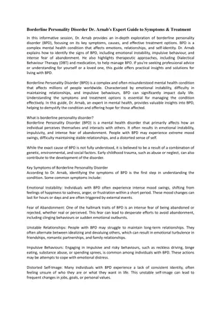 Borderline Personality Disorder (BPD) is part of the Cluster B Personality Types characterized by emotional instability, impulsivity, and strained relationships. Approaches for BPD include dialectical behavior therapy (DBT) and cognitive-behavioral therapy (CBT), while interventions involve emotion regulation techniques and boundary setting. Self-care when working with BPD individuals is essential to maintain boundaries, manage stress, and seek support.