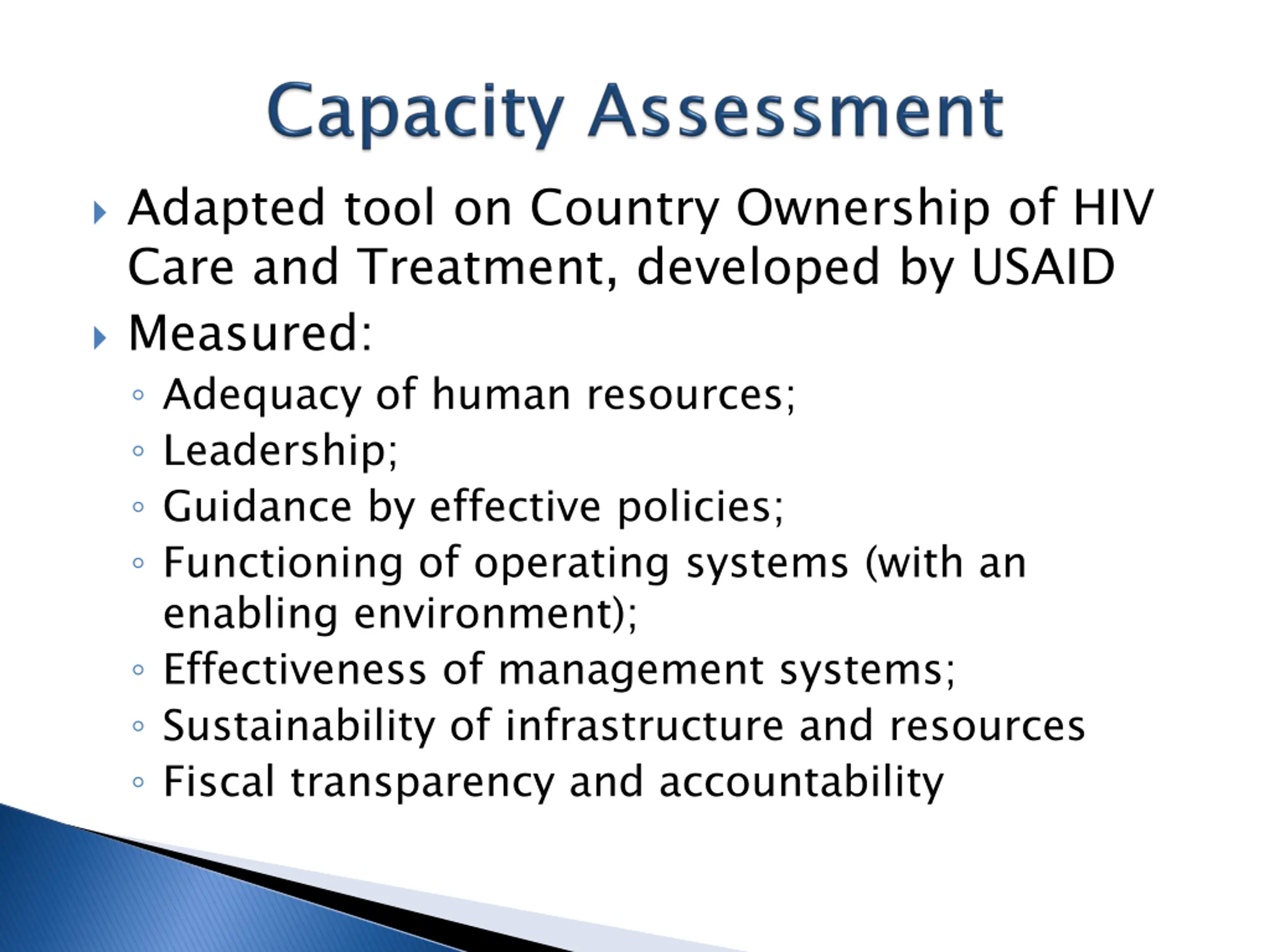 Adapted tool on Country Ownership of HIV Care and Treatment, developed by USAID Measured: Adequacy of human resources; Leadership; Guidance by effective policies; Functioning of operating systems (with an enabling environment); Effectiveness of management systems; Sustainability of infrastructure and resources Fiscal transparency and accountability