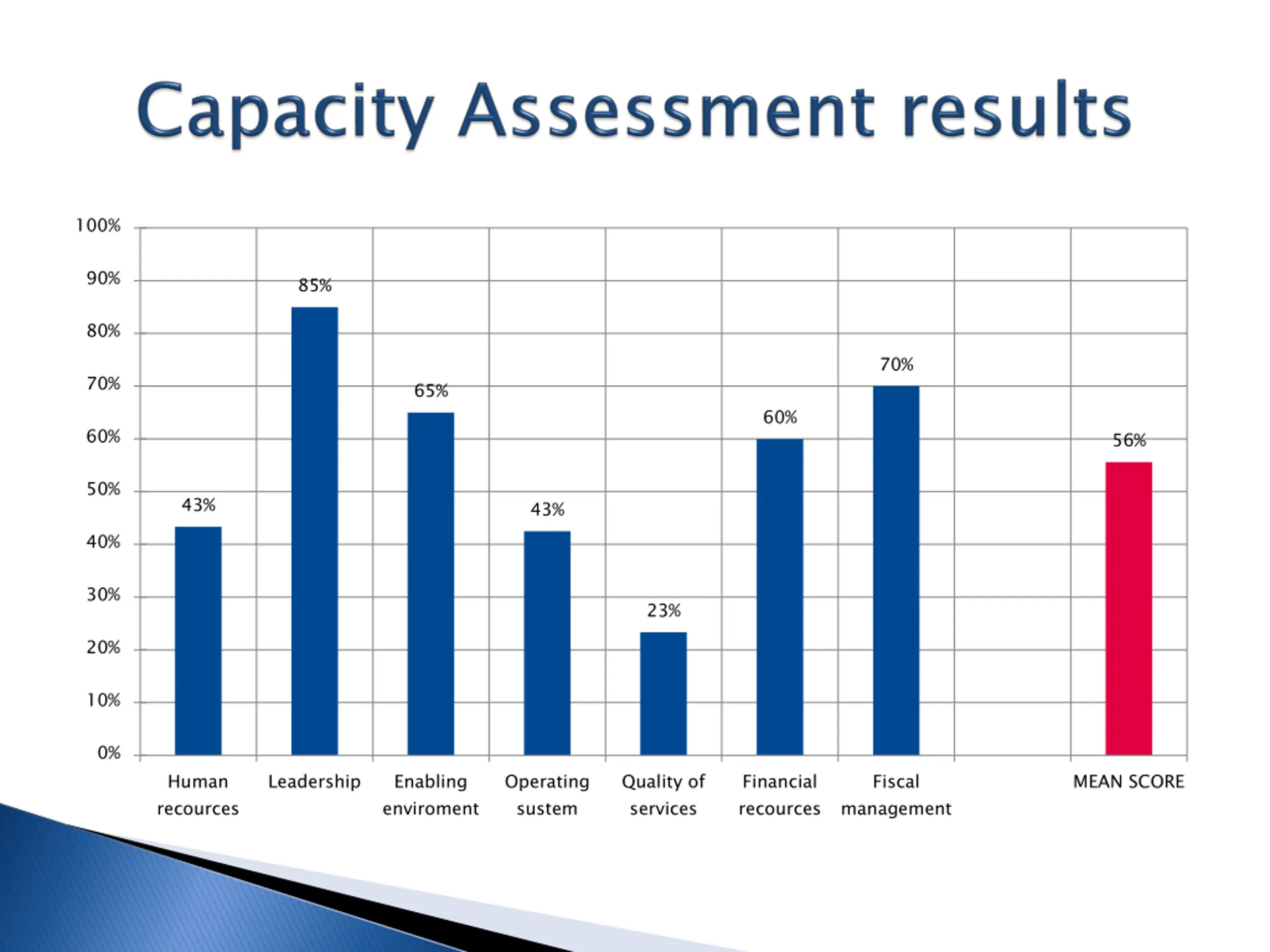 100% 90% 85% 80% 70% 70% 65% 60% 60% 56% 50% 43% 43% 40% 30% 23% 20% 10% 0% Human recources Leadership Enabling enviroment Operating sustem Quality of services Financial recources Fiscal MEAN SCORE management