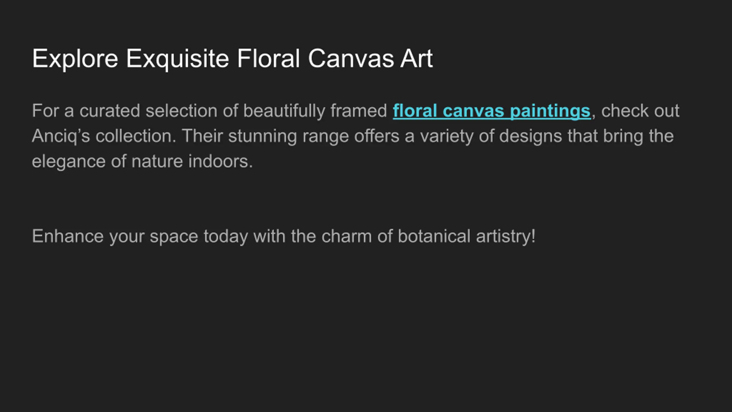 Explore Exquisite Floral Canvas Art For a curated selection of beautifully framed floral canvas paintings, check out Anciq s collection. Their stunning range offers a variety of designs that bring the elegance of nature indoors. Enhance your space today with the charm of botanical artistry!