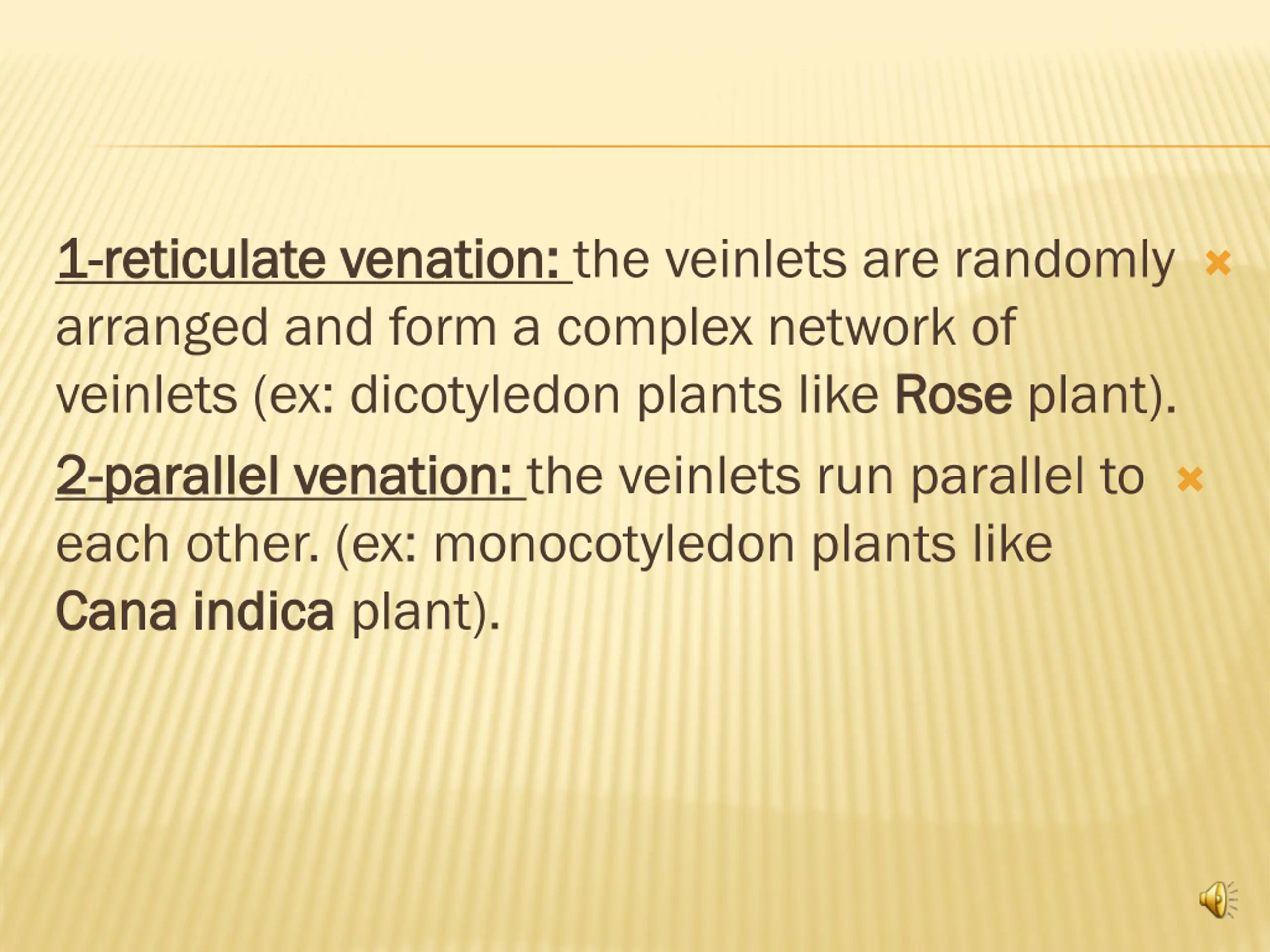 1 1- -reticulate venation: reticulate venation: the veinlets are randomly arranged and form a complex network of veinlets (ex: dicotyledon plants like Rose 2 2- -parallel venation: parallel venation: the veinlets run parallel to each other. (ex: monocotyledon plants like Cana Cana indica indica plant). Rose plant).