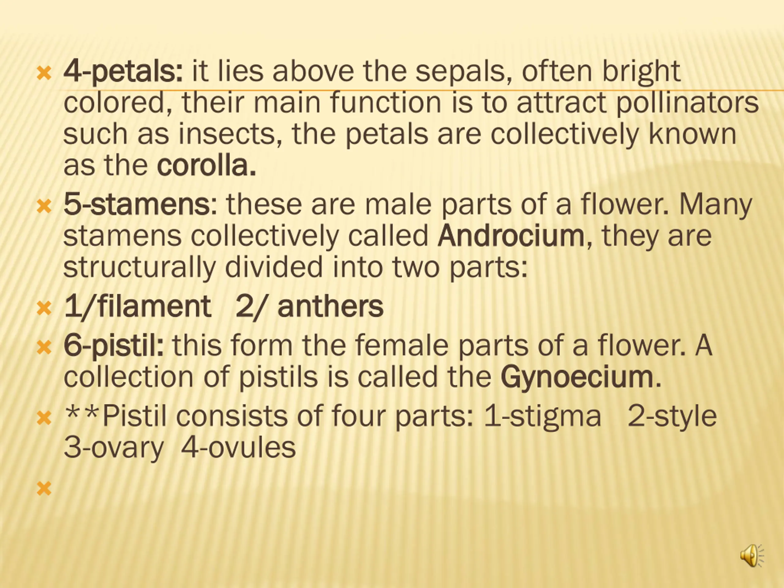 4 4- -petals: petals: it lies above the sepals, often bright colored, their main function is to attract pollinators such as insects, the petals are collectively known as the corolla. corolla. 5 5- -stamens stamens: these are male parts of a flower. Many stamens collectively called Androcium structurally divided into two parts: 1 1/filament /filament 2 2/ anthers / anthers 6 6- -pistil: pistil: this form the female parts of a flower. A collection of pistils is called the Gynoecium **Pistil consists of four parts: 1-stigma 2-style 3-ovary 4-ovules Androcium, they are Gynoecium.