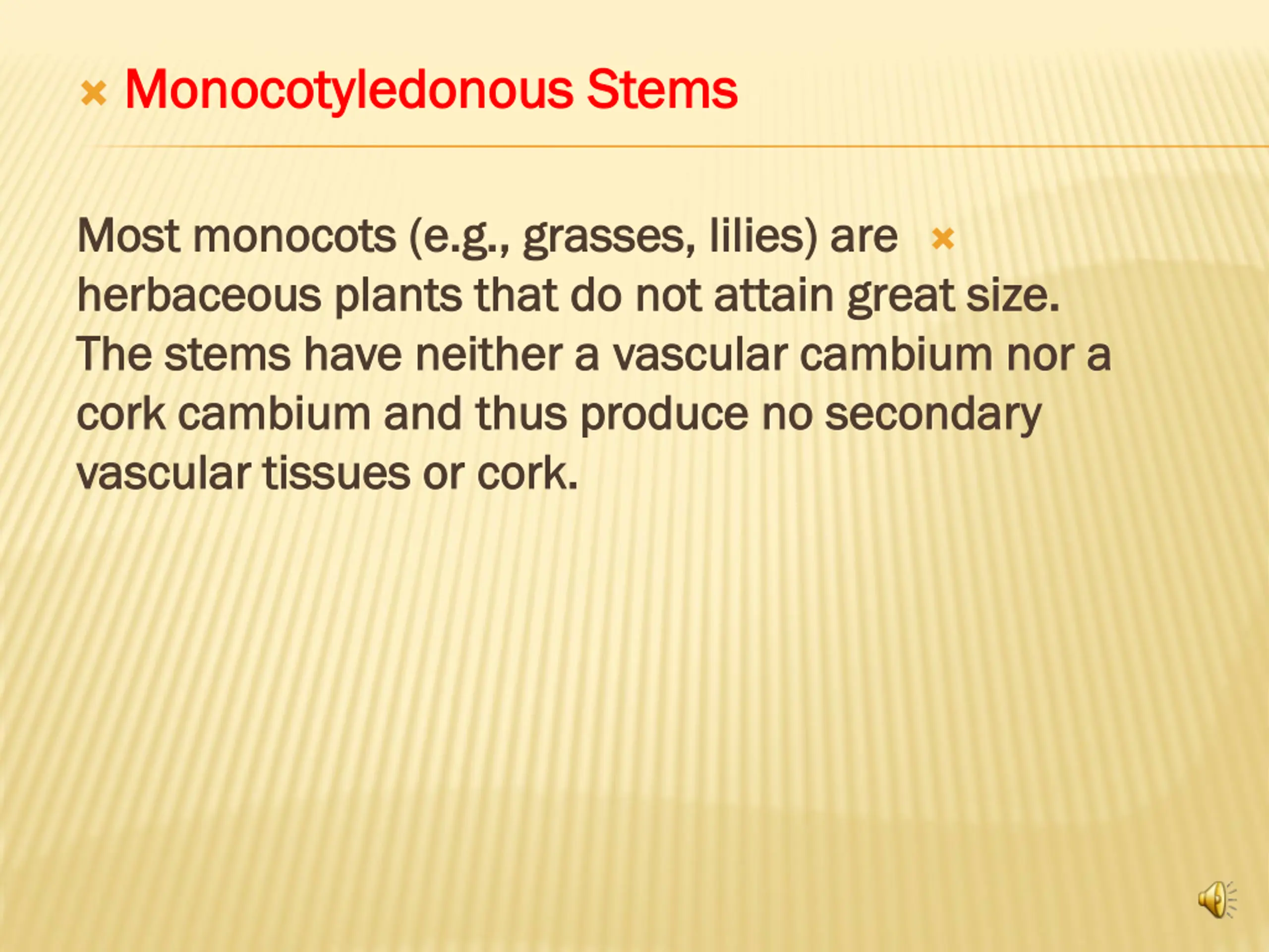 Monocotyledonous Stems Monocotyledonous Stems Most monocots ( Most monocots (e. e.g., herbaceous plants that do not attain great size. herbaceous plants that do not attain great size. The stems have neither a vascular cambium nor a The stems have neither a vascular cambium nor a cork cambium and thus produce no secondary cork cambium and thus produce no secondary vascular tissues or cork. vascular tissues or cork. g., grasses, grasses, lilies) lilies) are are