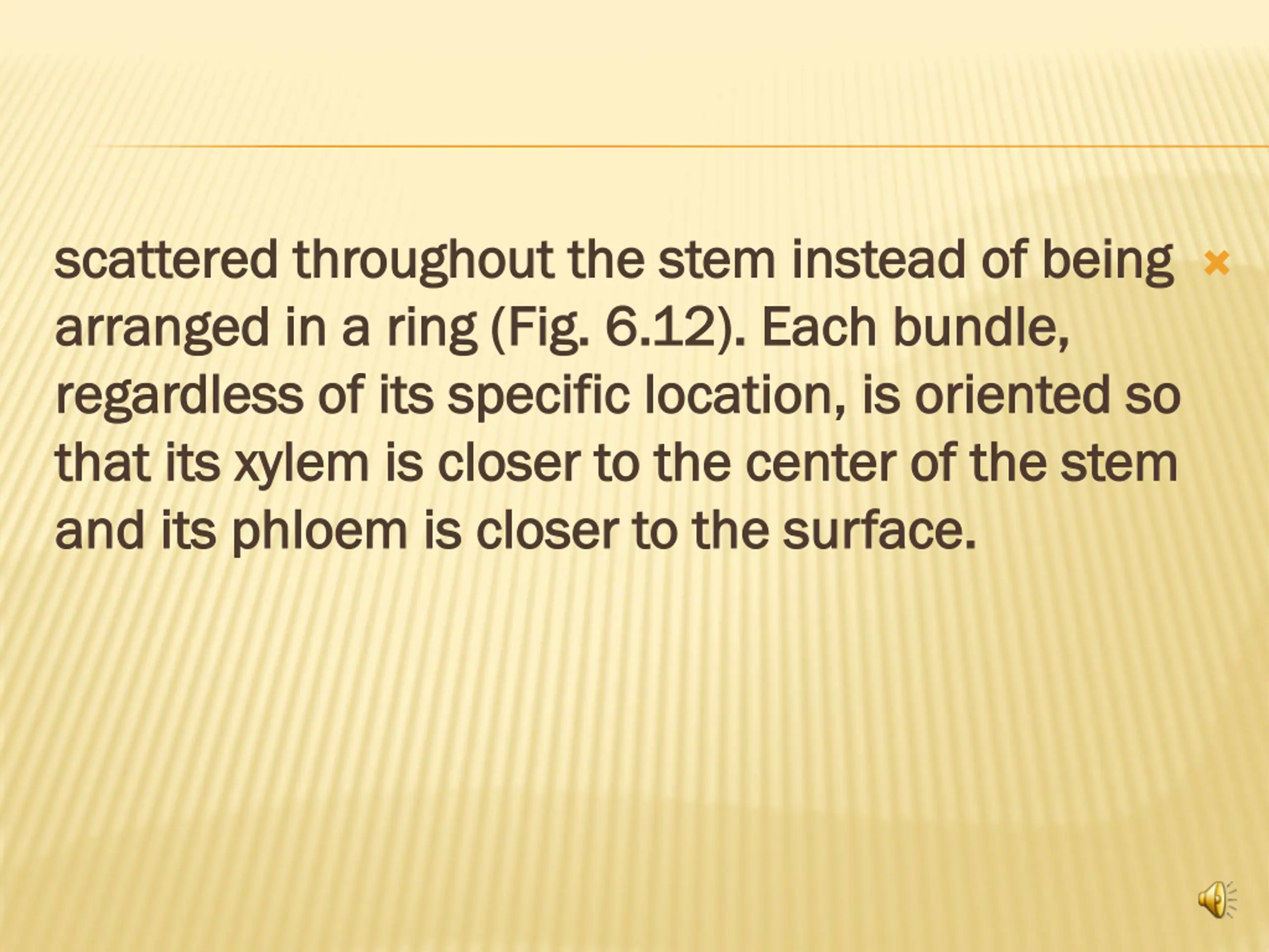 scattered throughout the stem instead of being scattered throughout the stem instead of being arranged in a ring ( arranged in a ring (Fig. Fig. 6.12 6.12). ). Each bundle, regardless of its specific location, regardless of its specific location, is oriented so that its xylem is closer to the center of the stem that its xylem is closer to the center of the stem and its phloem is closer to the surface. and its phloem is closer to the surface. Each bundle, is oriented so