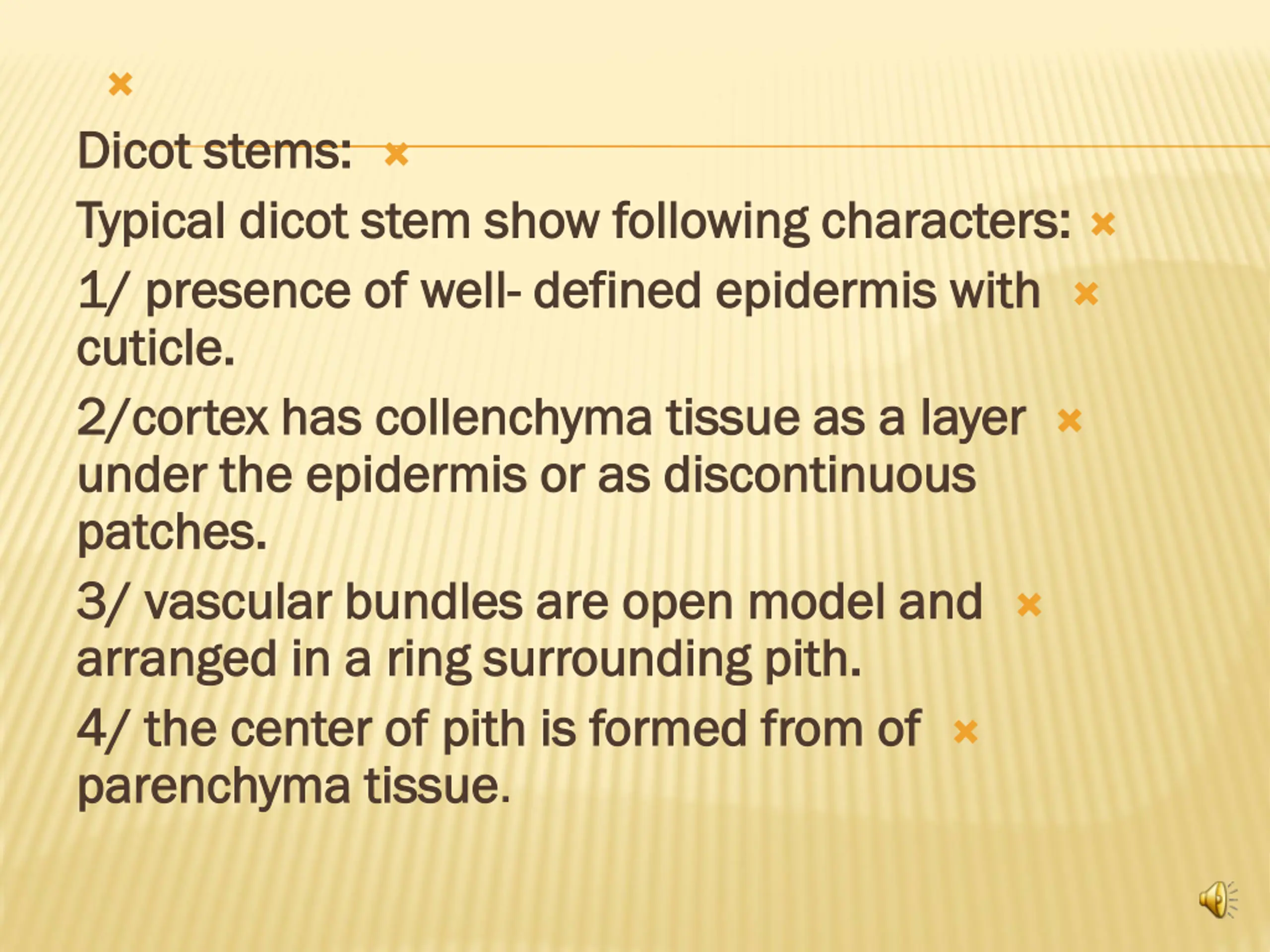 Dicot Dicot stems: stems: Typical Typical dicot 1 1/ / presence of well presence of well- - defined epidermis with defined epidermis with cuticle. cuticle. 2 2/ /cortex has cortex has collenchyma collenchyma tissue as a layer under the epidermis or as discontinuous under the epidermis or as discontinuous patches. patches. 3 3/ / vascular bundles are open model and vascular bundles are open model and arranged in a ring surrounding pith. arranged in a ring surrounding pith. 4 4/ / the center of pith is formed from of the center of pith is formed from of parenchyma tissue parenchyma tissue. dicot stem show following characters: stem show following characters: tissue as a layer