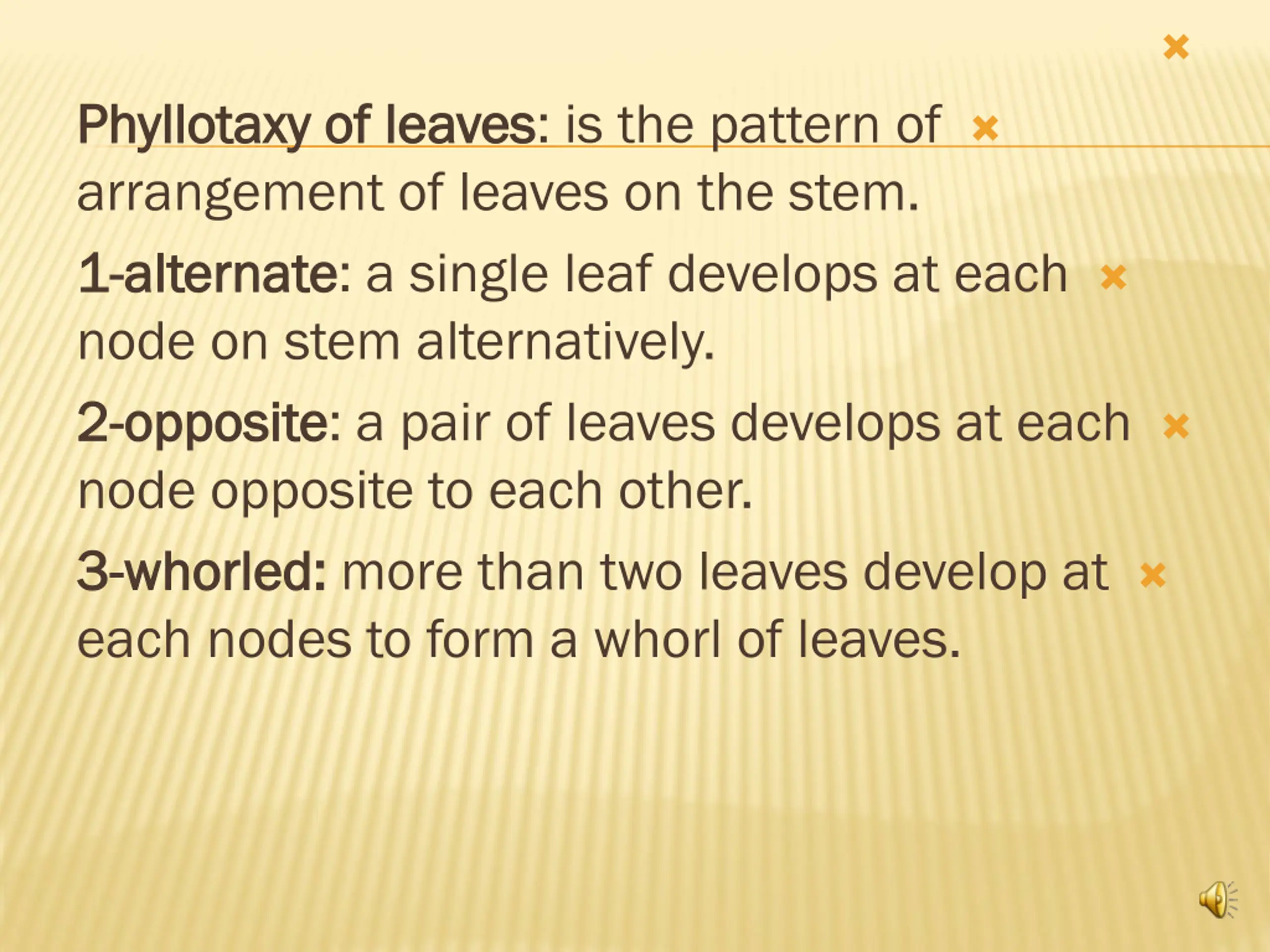 Phyllotaxy Phyllotaxy of leaves arrangement of leaves on the stem. 1 1- -alternate alternate: a single leaf develops at each node on stem alternatively. 2 2- -opposite opposite: a pair of leaves develops at each node opposite to each other. 3 3- -whorled: whorled: more than two leaves develop at each nodes to form a whorl of leaves. of leaves: is the pattern of
