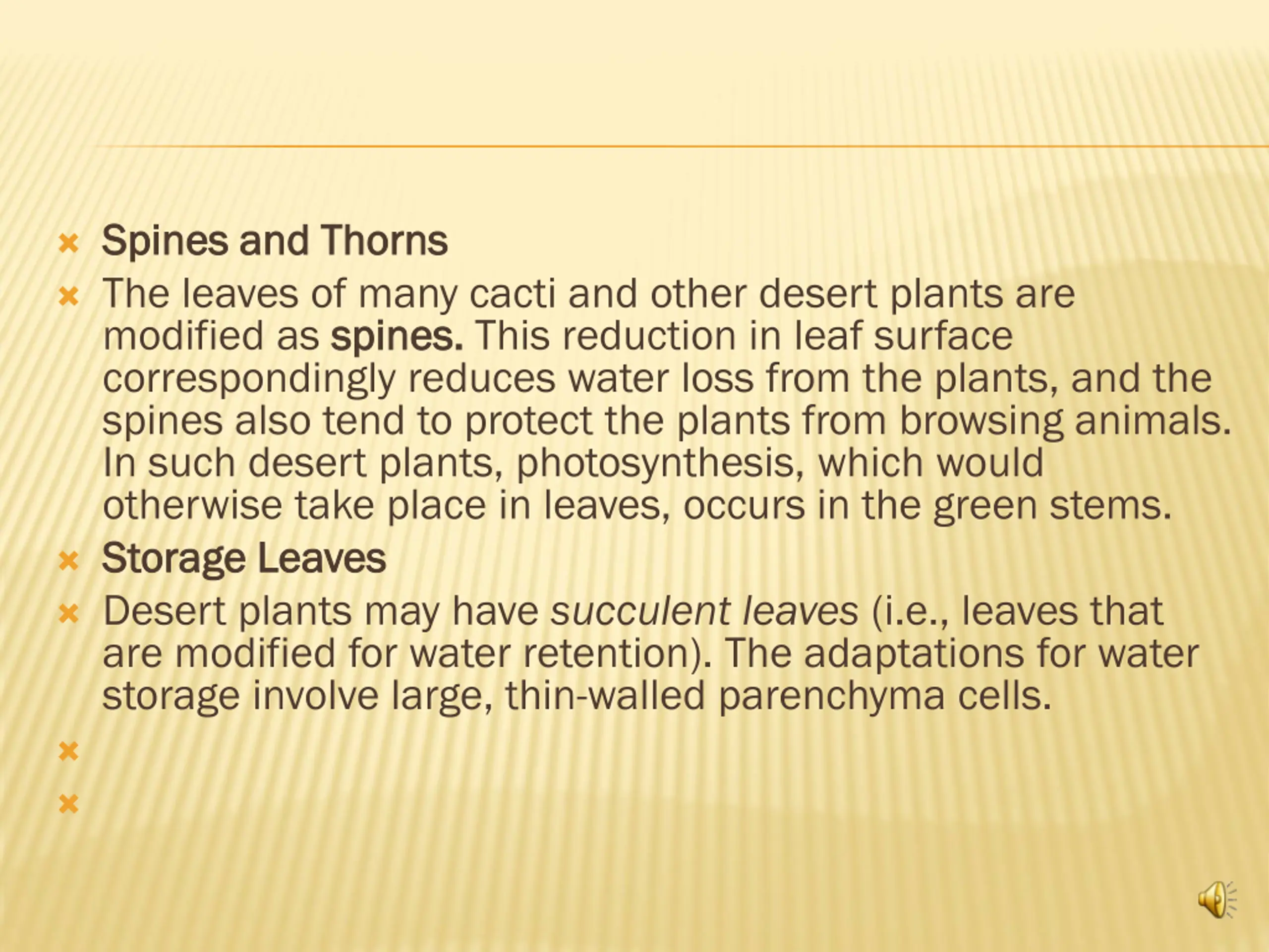 Spines and Thorns Spines and Thorns The leaves of many cacti and other desert plants are modified as spines. spines. This reduction in leaf surface correspondingly reduces water loss from the plants, and the spines also tend to protect the plants from browsing animals. In such desert plants, photosynthesis, which would otherwise take place in leaves, occurs in the green stems. Storage Leaves Storage Leaves Desert plants may have succulent leaves (i.e., leaves that are modified for water retention). The adaptations for water storage involve large, thin-walled parenchyma cells.