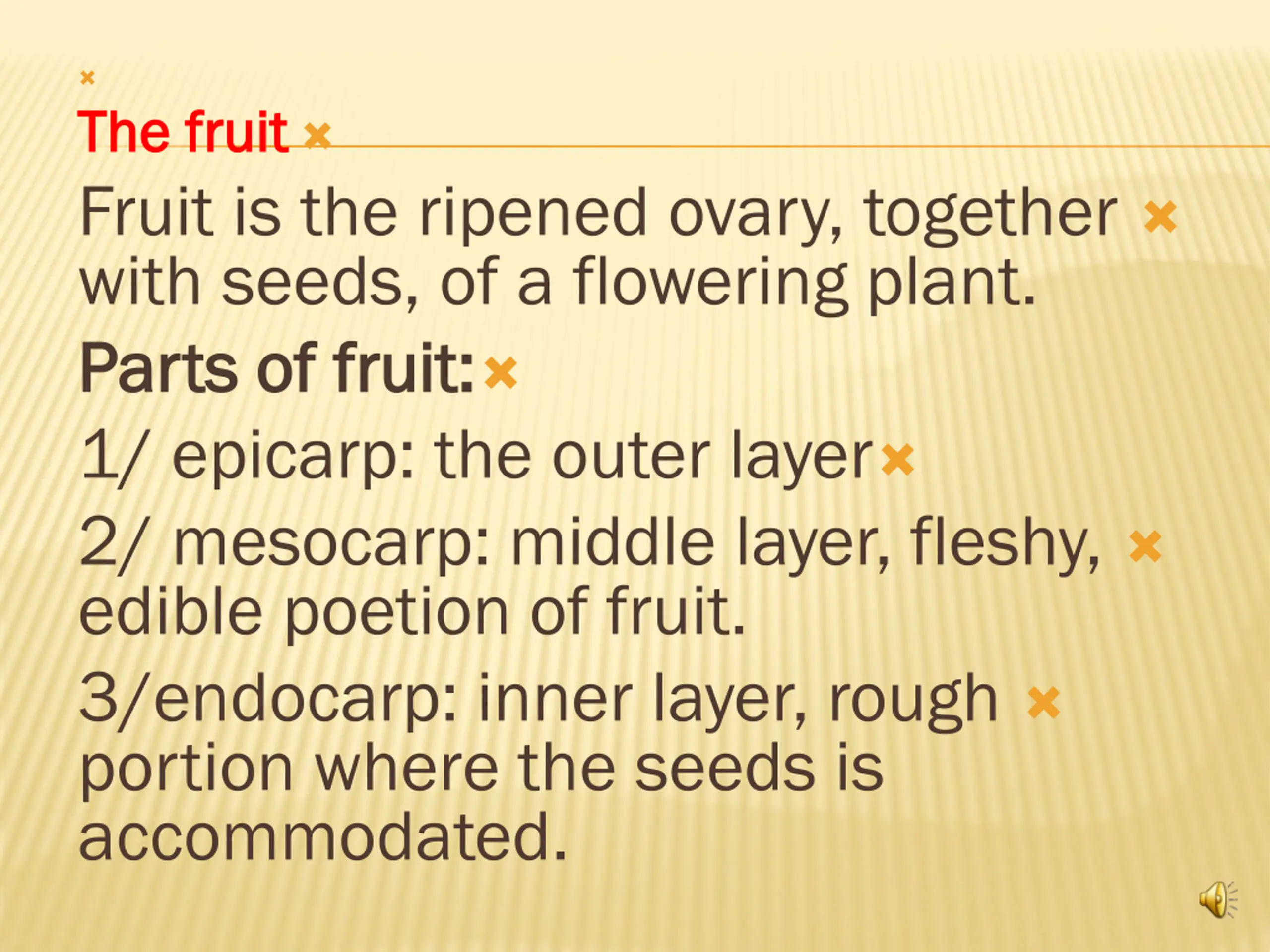 The fruit The fruit Fruit is the ripened ovary, together with seeds, of a flowering plant. Parts of fruit: Parts of fruit: 1/ epicarp: the outer layer 2/ mesocarp: middle layer, fleshy, edible poetion of fruit. 3/endocarp: inner layer, rough portion where the seeds is accommodated.