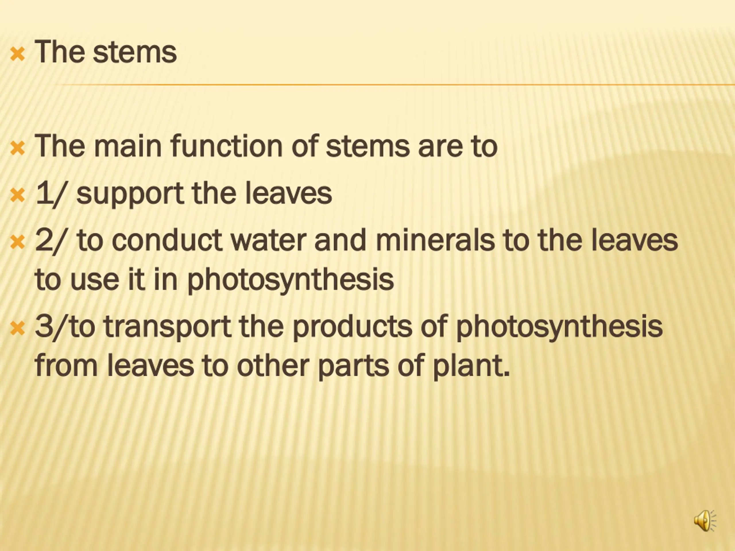The stems The stems The main function of stems are to The main function of stems are to 1 1/ support the leaves / support the leaves 2 2/ to conduct water and minerals to the leaves / to conduct water and minerals to the leaves to use it in photosynthesis to use it in photosynthesis 3 3/to transport the products of photosynthesis /to transport the products of photosynthesis from leaves to other parts of plant. from leaves to other parts of plant.
