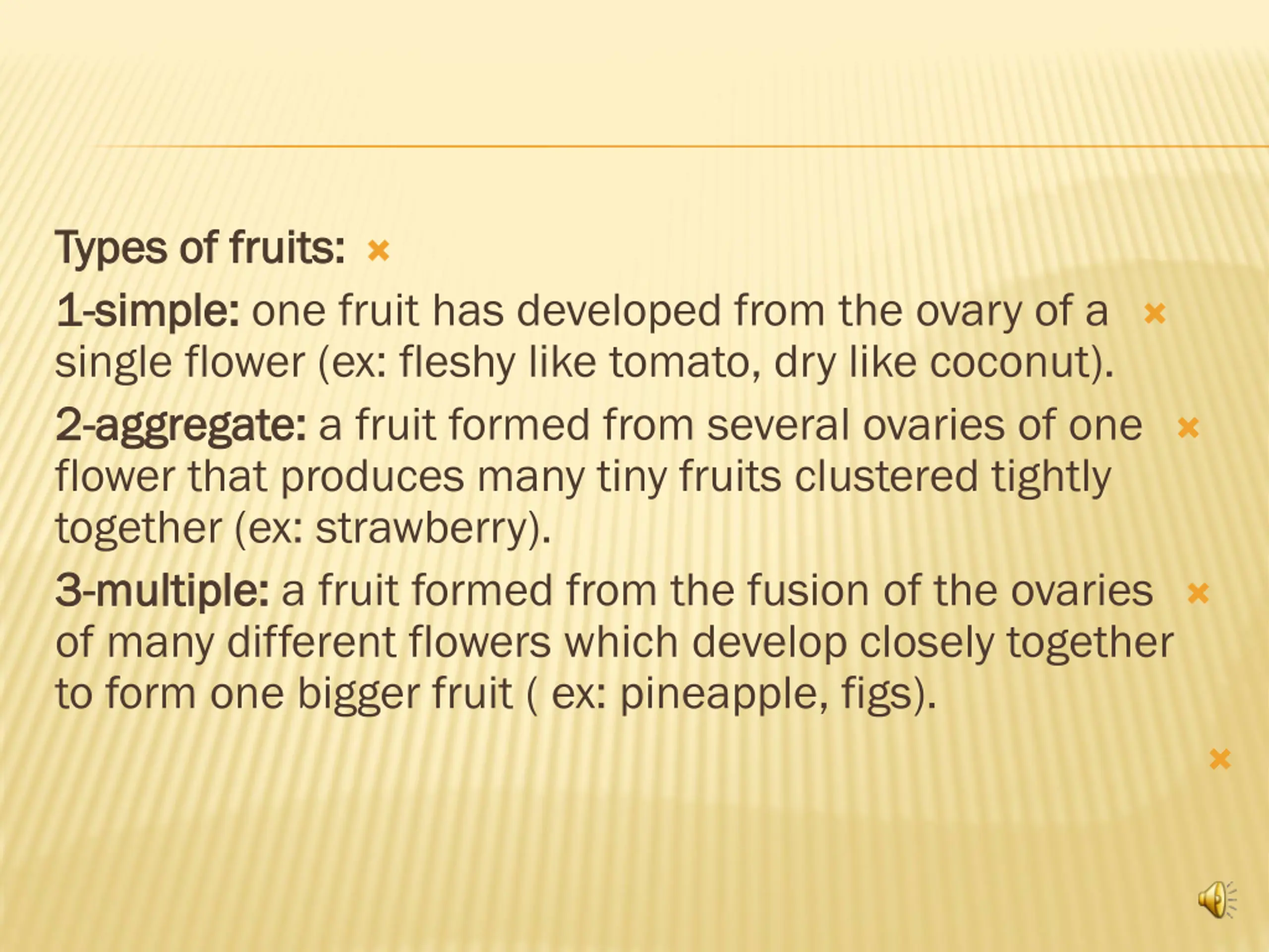 Types of fruits: Types of fruits: 1 1- -simple: simple: one fruit has developed from the ovary of a single flower (ex: fleshy like tomato, dry like coconut). 2 2- -aggregate: aggregate: a fruit formed from several ovaries of one flower that produces many tiny fruits clustered tightly together (ex: strawberry). 3 3- -multiple: multiple: a fruit formed from the fusion of the ovaries of many different flowers which develop closely together to form one bigger fruit ( ex: pineapple, figs).