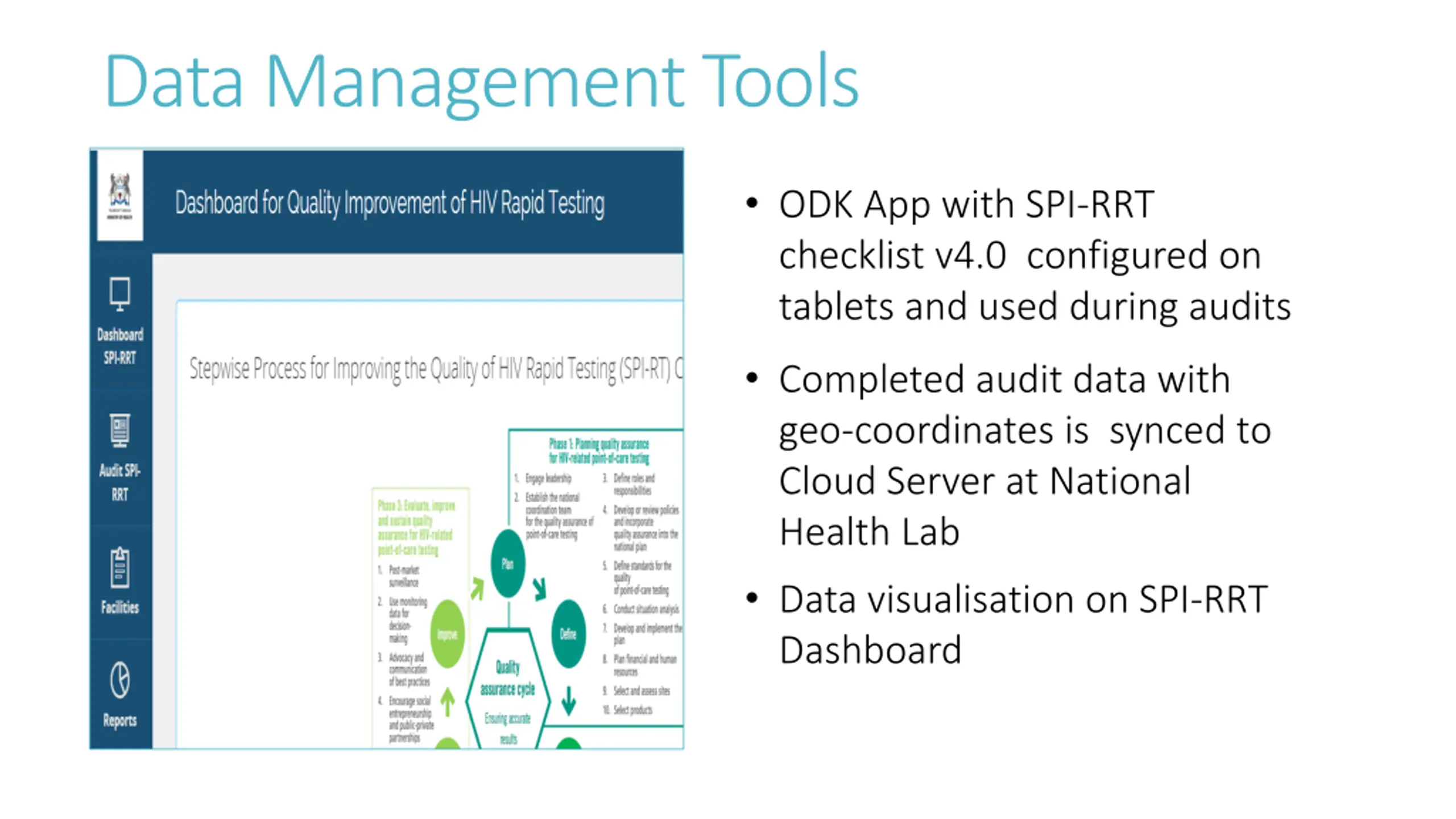 Data Management Tools ODK App with SPI-RRT checklist v4.0 configured on tablets and used during audits Completed audit data with geo-coordinates is synced to Cloud Server at National Health Lab Data visualisation on SPI-RRT Dashboard