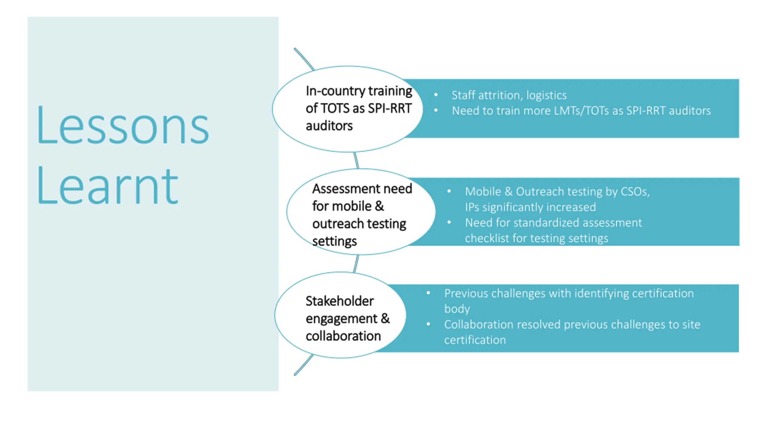 In In- -country training country training of TOTS as SPI of TOTS as SPI- -RRT auditors auditors Staff attrition, logistics Need to train more LMTs/TOTs as SPI-RRT auditors Lessons Learnt RRT Assessment need Assessment need for mobile & for mobile & outreach testing outreach testing settings settings Mobile & Outreach testing by CSOs, IPs significantly increased Need for standardized assessment checklist for testing settings Previous challenges with identifying certification body Collaboration resolved previous challenges to site certification Stakeholder Stakeholder engagement & engagement & collaboration collaboration