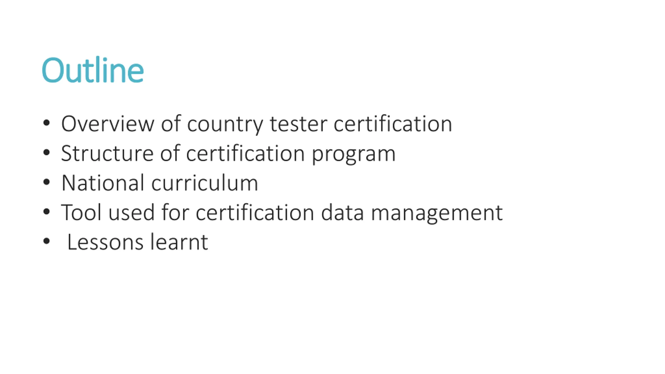 Outline Outline Overview of country tester certification Structure of certification program National curriculum Tool used for certification data management Lessons learnt