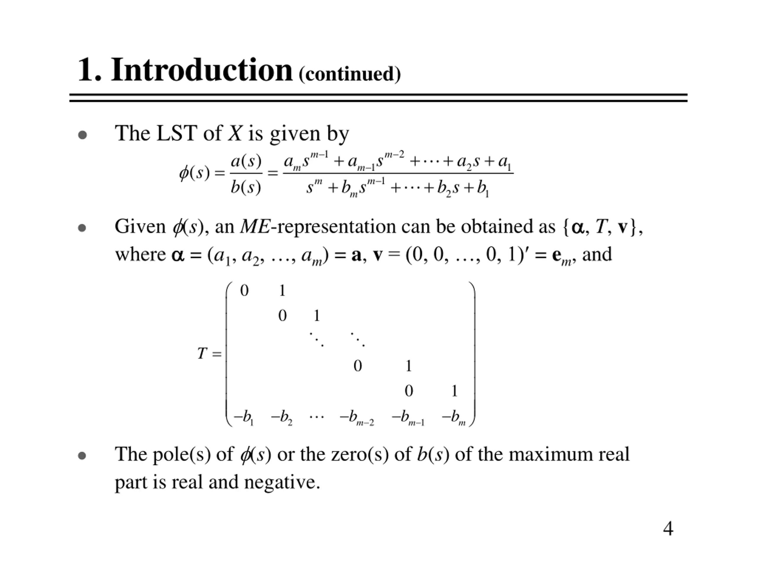 1. Introduction (continued) The LST of X is given by a s s b s + + + + 1 2 m m a s a s a s + a ( ) ( ) = = ( ) 1 2 1 m m + + + 1 m m s b s b s b 2 1 m Given (s), an ME-representation can be obtained as { , T, v}, where = (a1, a2, , am) = a, v= (0, 0, , 0, 1) = em, and 0 1 0 1 = T 0 1 0 b 1 b b b b 1 2 2 1 m m m The pole(s) of (s) or the zero(s) of b(s) of the maximum real part is real and negative. 4