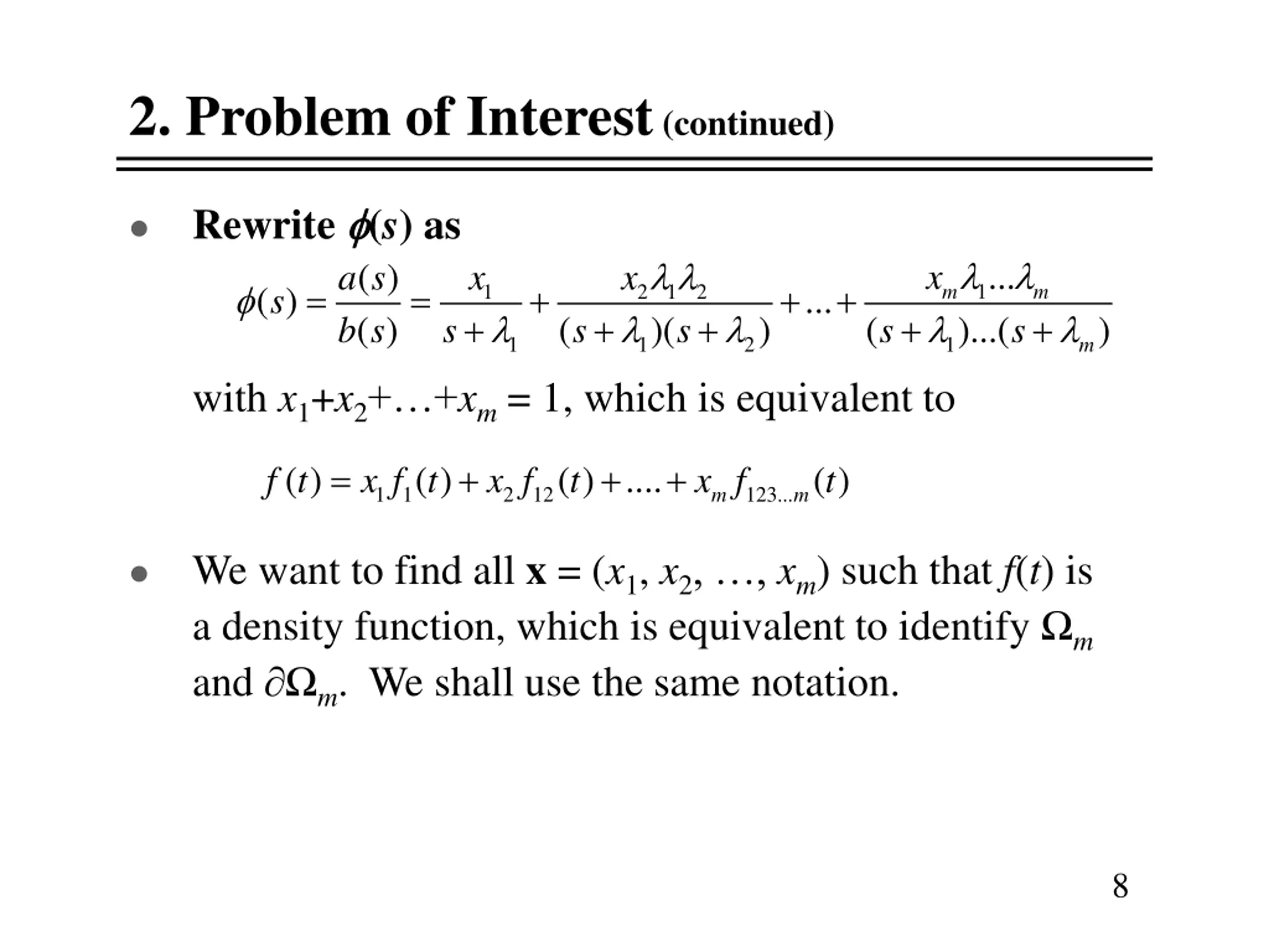 2. Problem of Interest (continued) Rewrite (s) as ... ( ) ( ) b s x x x a s = = + + + ( ) s ... 1 m m + 1 + 2 1 2 )( + + + ( ) ( )...( ) s s s s s 1 1 2 1 m with x1+x2+ +xm = 1, which is equivalent to = + ( ) .... t + + ( ) ( ) ( ) t f t 1 1 x f t 2 12 x f x f 123... m m We want to find all x = (x1, x2, , xm) such that f(t) is a density function, which is equivalent to identify m and m. We shall use the same notation. 8