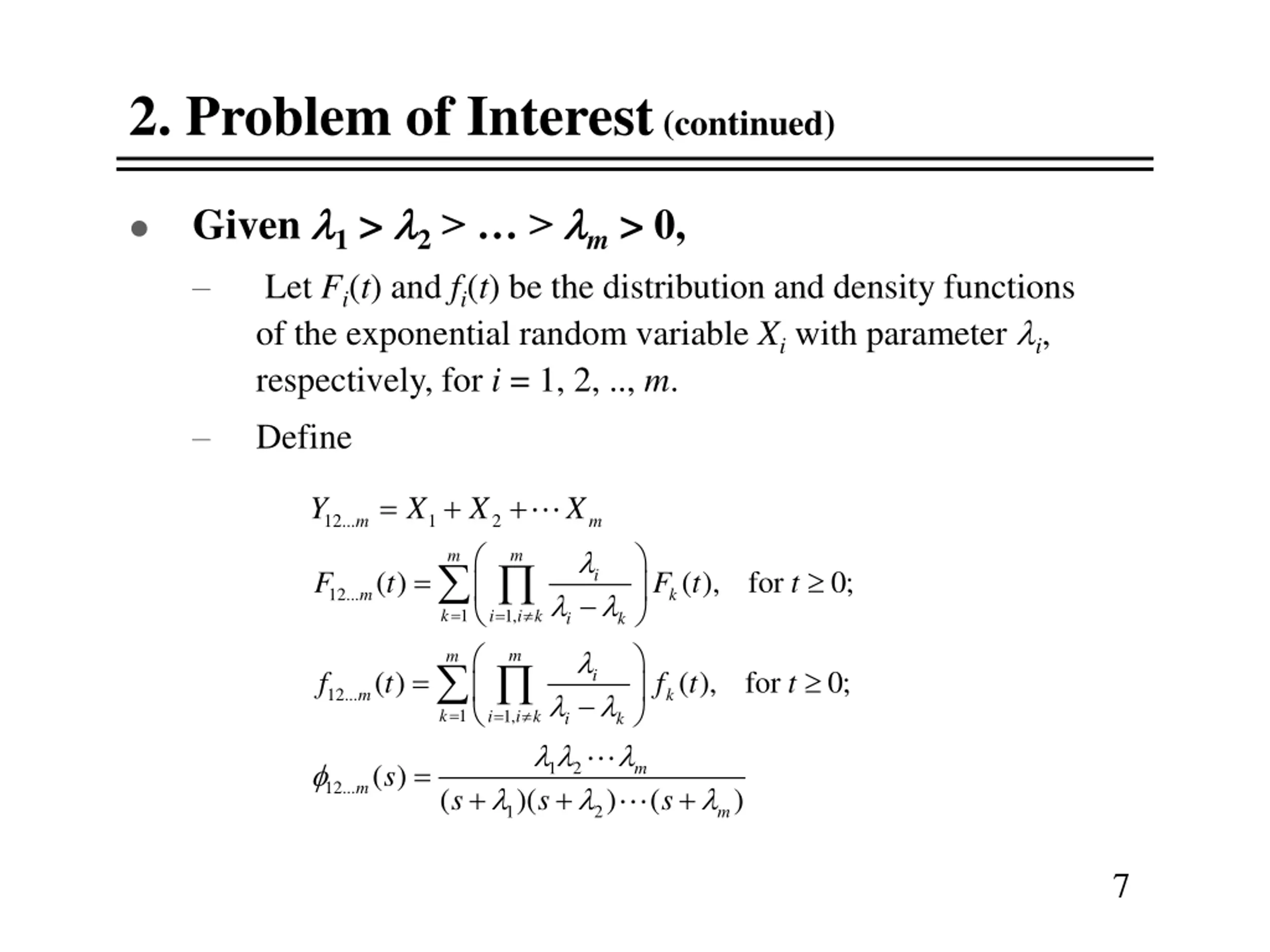 2. Problem of Interest (continued) Given 1 > 2> > m > 0, Let Fi(t) and fi(t) be the distribution and density functions of the exponential random variable Xi with parameter i, respectively, for i = 1, 2, .., m. Define = + + 12... Y X X X 1 2 m m m m = ( ) t ( ), for 0; i 12... F F t t m k = = i k 1 k 1, i i k m m = ( ) t ( ), for 0; i 12... f f t t m k = = i k 1 k 1, i i k + = ( ) s 1 2 m 12... m + + ( )( ) ( ) s s s 1 2 m 7