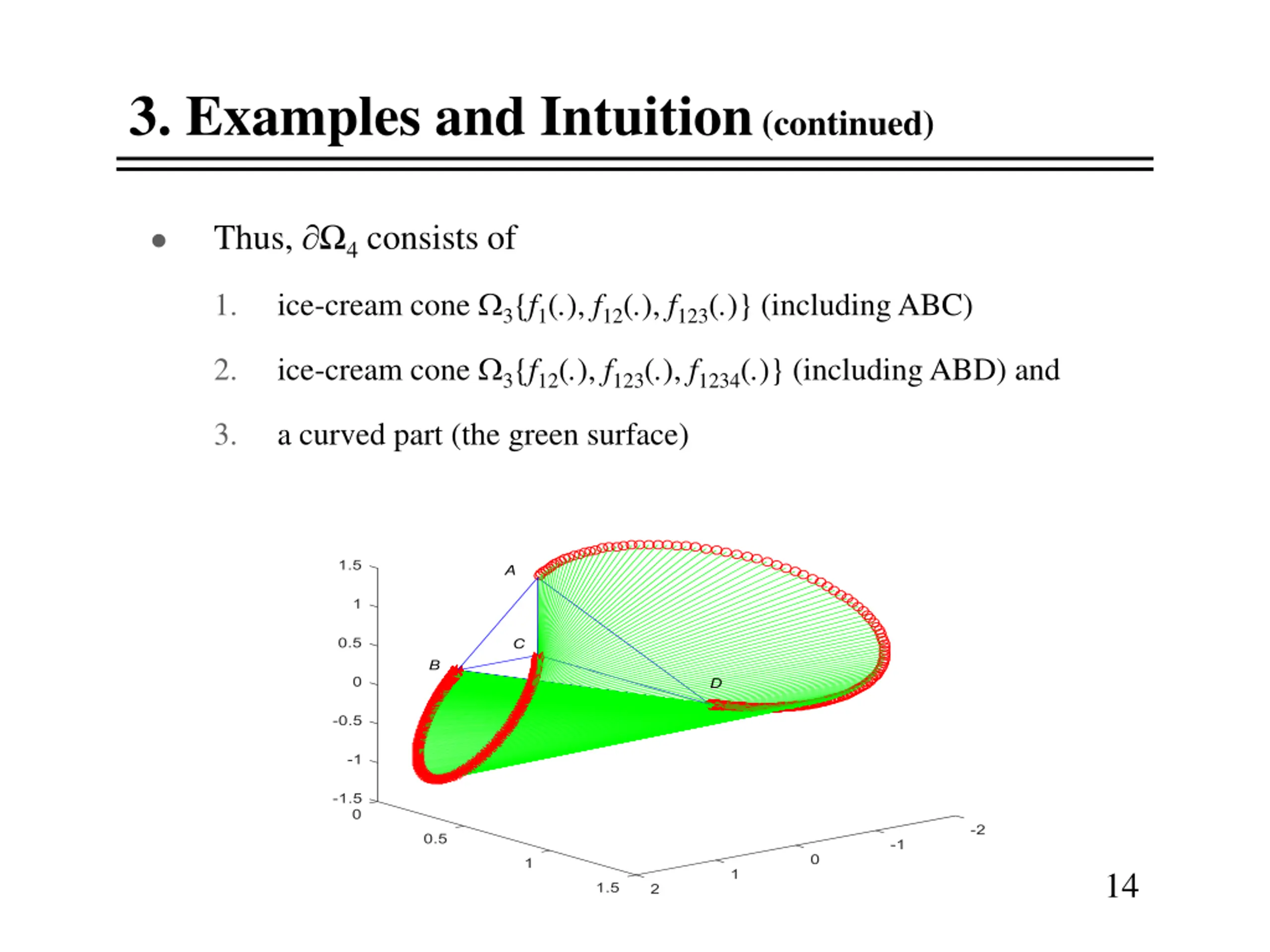 3. Examples and Intuition (continued) Thus, 4 consists of ice-cream cone 3{f1(.), f12(.), f123(.)} (including ABC) 1. ice-cream cone 3{f12(.), f123(.), f1234(.)} (including ABD) and 2. 3. a curved part (the green surface) 14