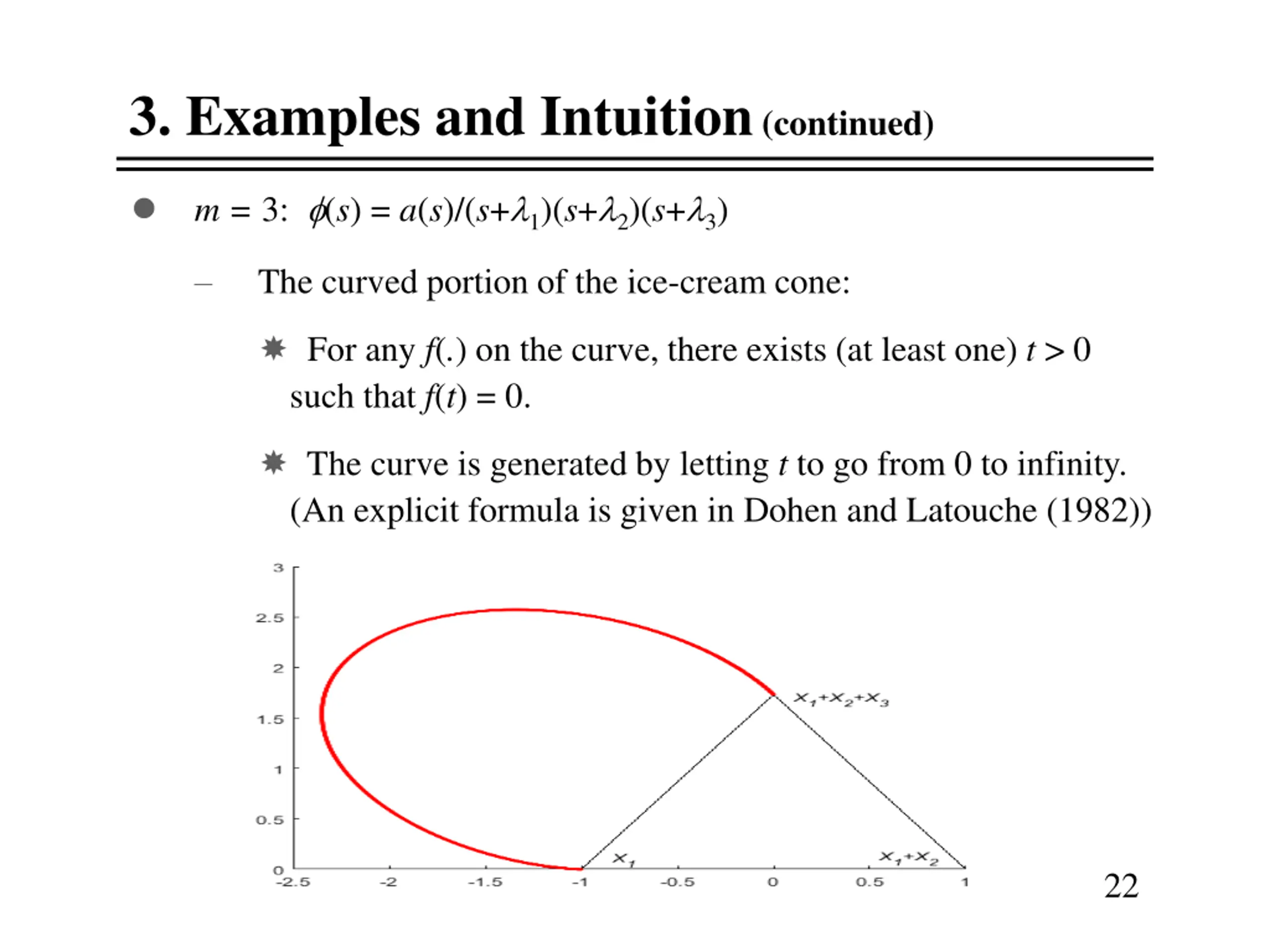 3. Examples and Intuition (continued) m = 3: (s) = a(s)/(s+ 1)(s+ 2)(s+ 3) The curved portion of the ice-cream cone: For any f(.) on the curve, there exists (at least one) t > 0 such that f(t) = 0. The curve is generated by letting t to go from 0 to infinity. (An explicit formula is given in Dohen and Latouche (1982)) 22
