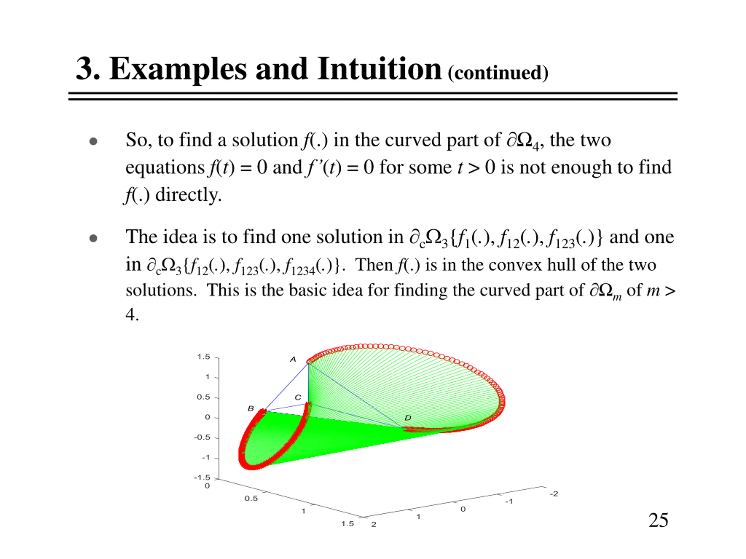 3. Examples and Intuition (continued) Find the curved part of 4: For t > 0, we use f(t) = 0 and f (t) = 0 to find the curved part of the boundary. For each t > 0, we find one solution g1,t(.) in c 3{f1(.), f12(.), f123(.)} and g2,t(.) in c 3{f12(.), f123(.), f1234(.)}. The curved part of 4 is: t>0 conh{g1,t(.), g2,t(.)}, where g1,t(.) c 3{f1(.), f12(.), f123(.)} and g2,t(.) c 3{f12(.), f123(.), f1234(.)} 15