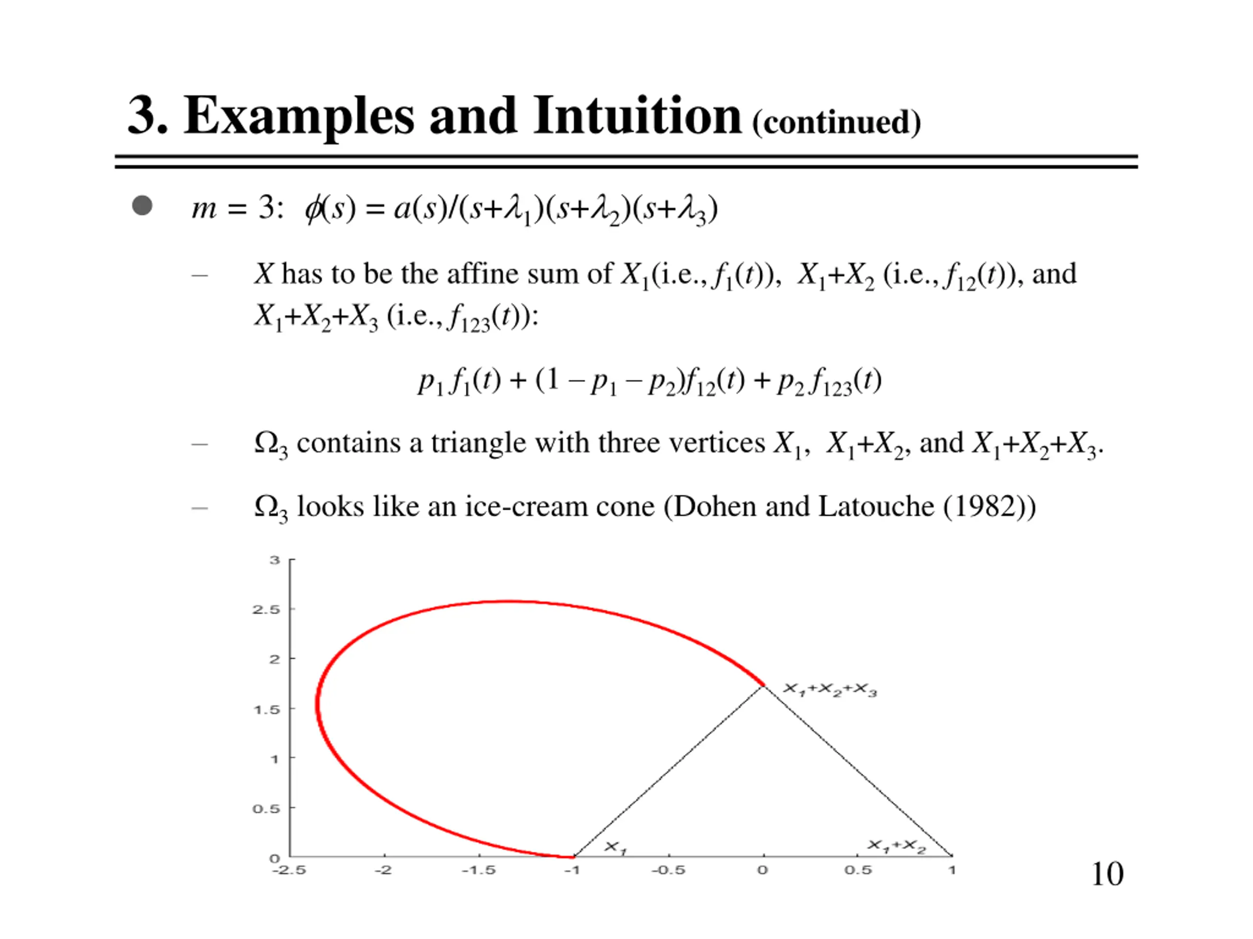 3. Examples and Intuition (continued) m = 3: (s) = a(s)/(s+ 1)(s+ 2)(s+ 3) X has to be the affine sum of X1(i.e., f1(t)), X1+X2 (i.e., f12(t)), and X1+X2+X3 (i.e., f123(t)): p1 f1(t) + (1 p1 p2)f12(t) + p2f123(t) 3 contains a triangle with three vertices X1, X1+X2, and X1+X2+X3. 3 looks like an ice-cream cone (Dohen and Latouche (1982)) 10