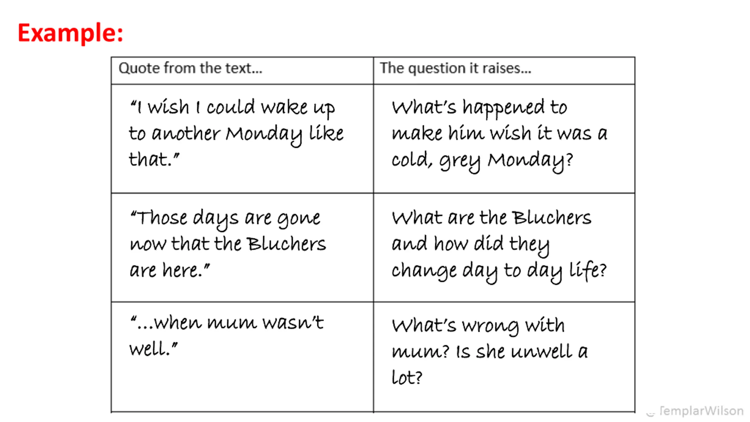 Example: I wish I could wake up I wish I could wake up to another Monday like to another Monday like that. that. What s happened to What s happened to make him wish it was a make him wish it was a cold, grey Monday? cold, grey Monday? Those days are gone Those days are gone now that the Bluchers now that the Bluchers are here. are here. What are the Bluchers What are the Bluchers and how did they and how did they change day to day life? change day to day life? when mum wasn t when mum wasn t well. well. What s wrong with What s wrong with mum? Is she unwell a mum? Is she unwell a lot? lot?