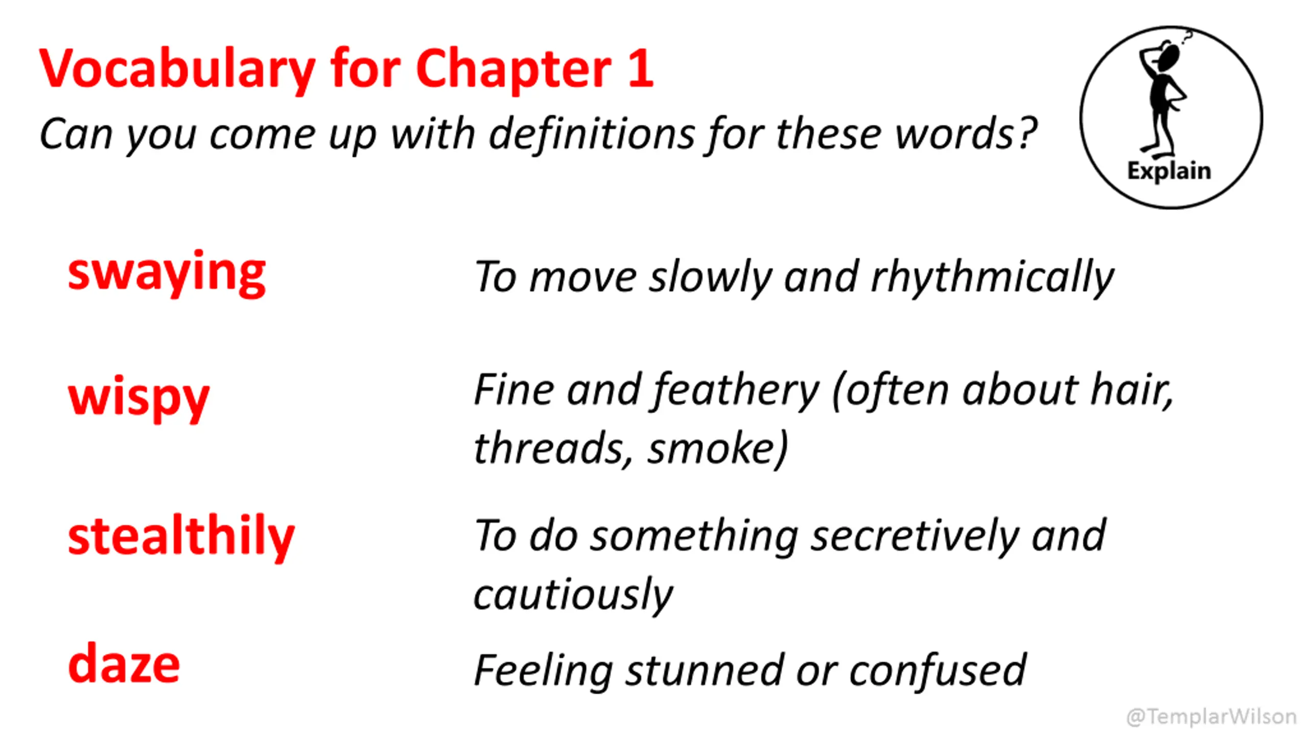 Vocabulary for Chapter 1 Can you come up with definitions for these words? swaying To move slowly and rhythmically Fine and feathery (often about hair, threads, smoke) wispy stealthily To do something secretively and cautiously daze Feeling stunned or confused