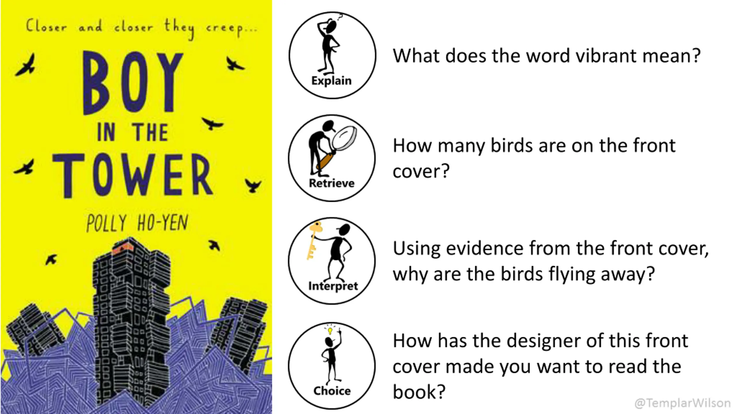What does the word vibrant mean? How many birds are on the front cover? Using evidence from the front cover, why are the birds flying away? How has the designer of this front cover made you want to read the book?