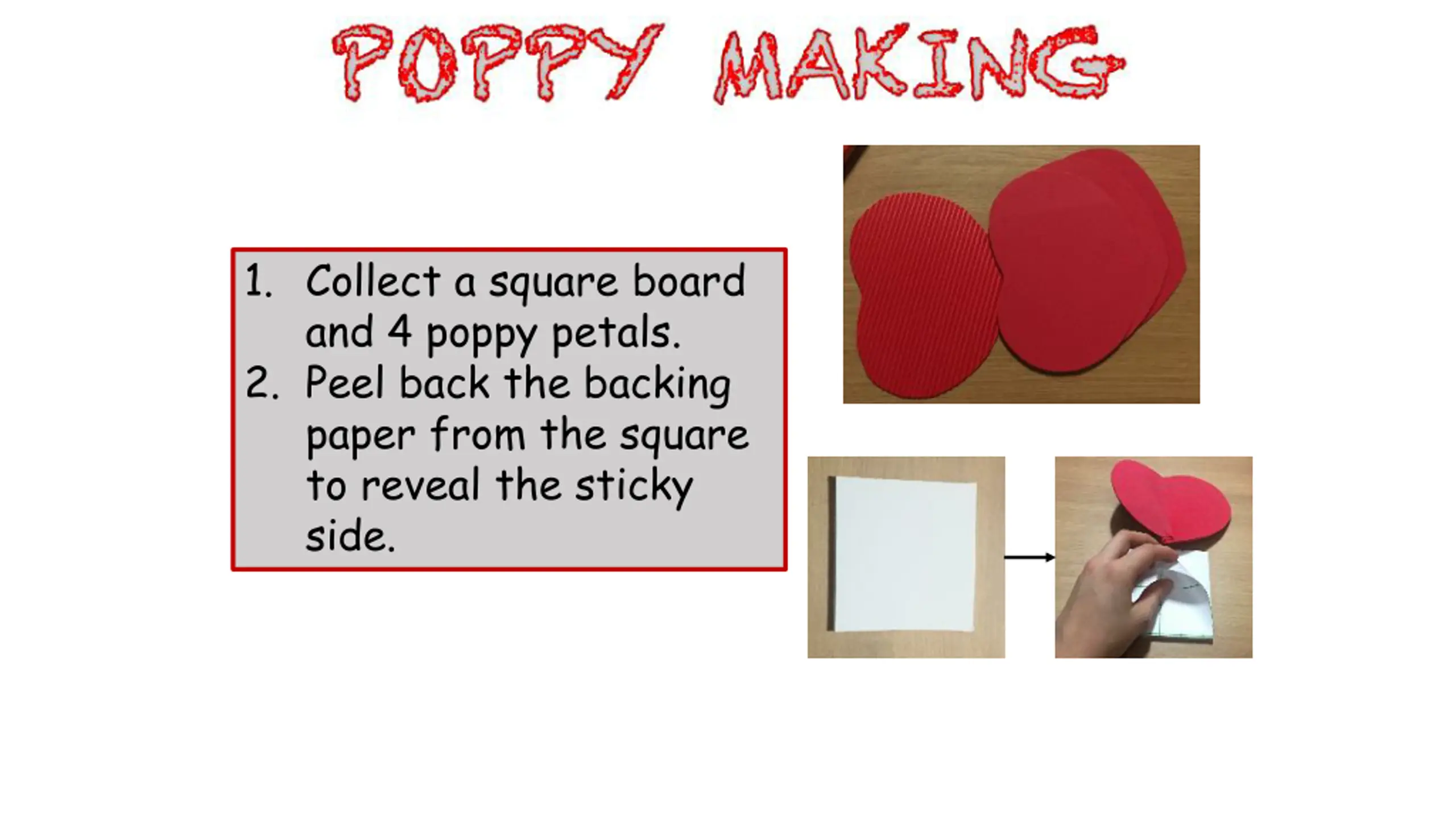 1. Collect a square board and 4 poppy petals. 2. Peel back the backing paper from the square to reveal the sticky side.