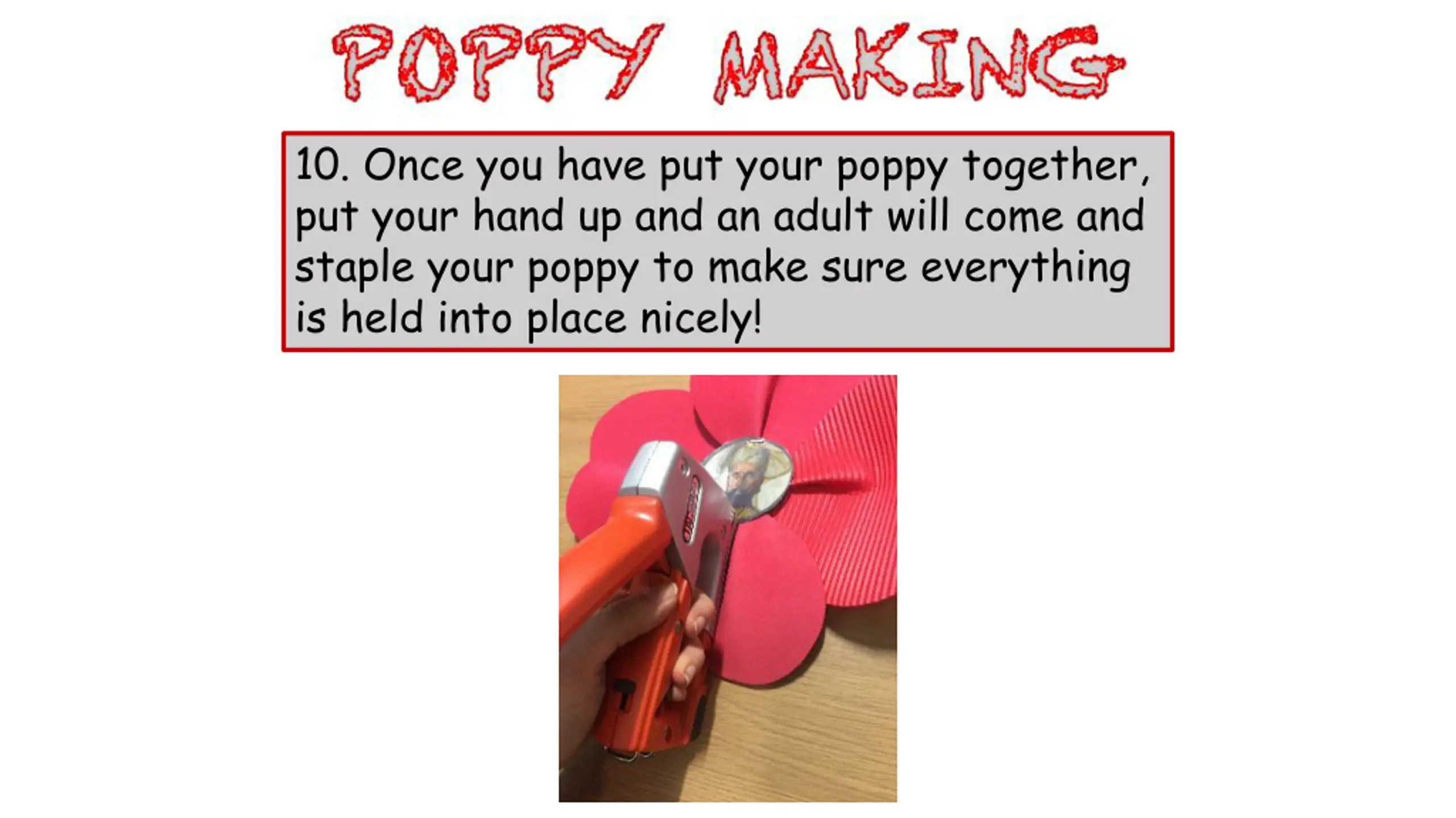 10. Once you have put your poppy together, put your hand up and an adult will come and staple your poppy to make sure everything is held into place nicely!