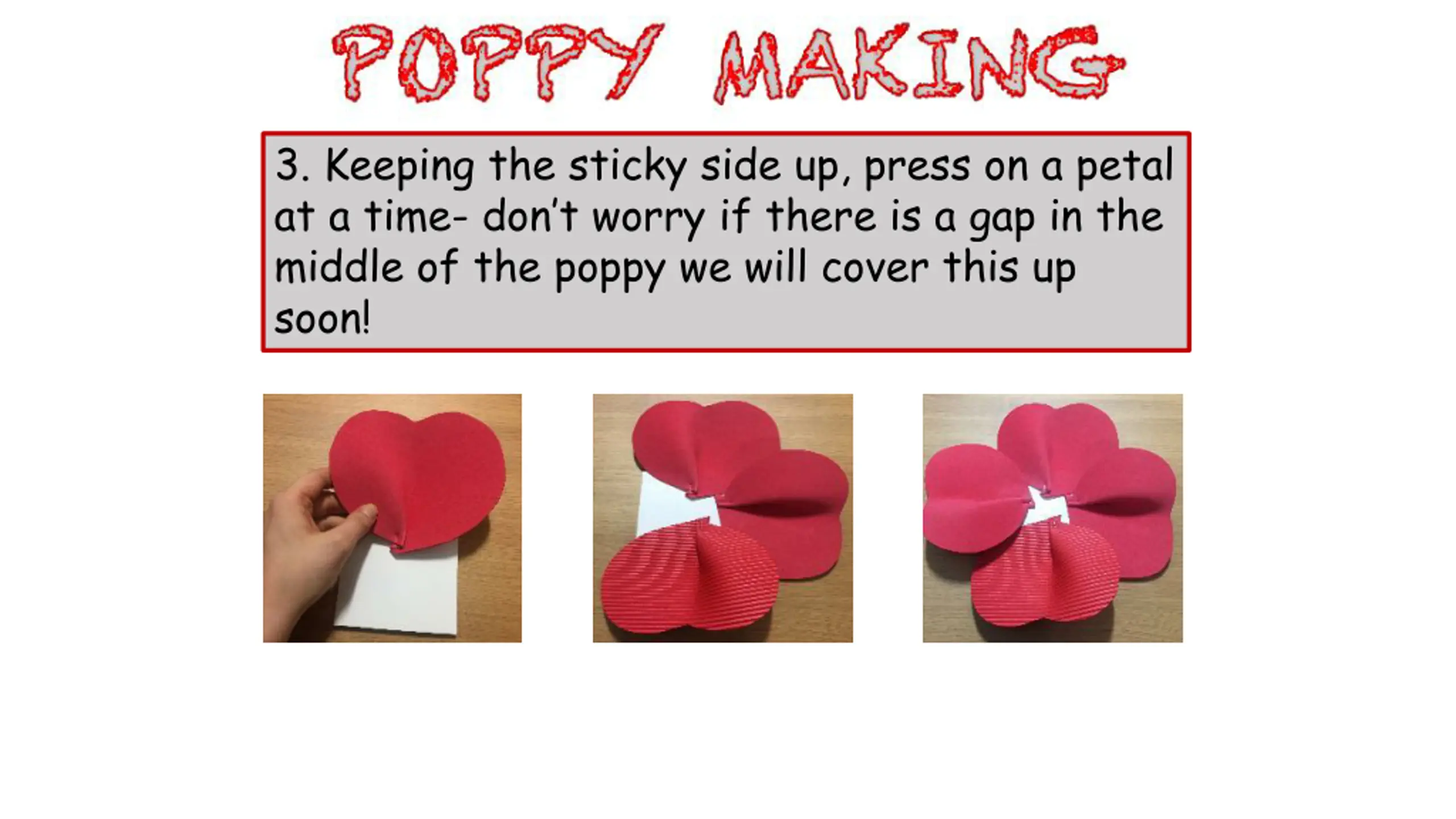 3. Keeping the sticky side up, press on a petal at a time- don t worry if there is a gap in the middle of the poppy we will cover this up soon!