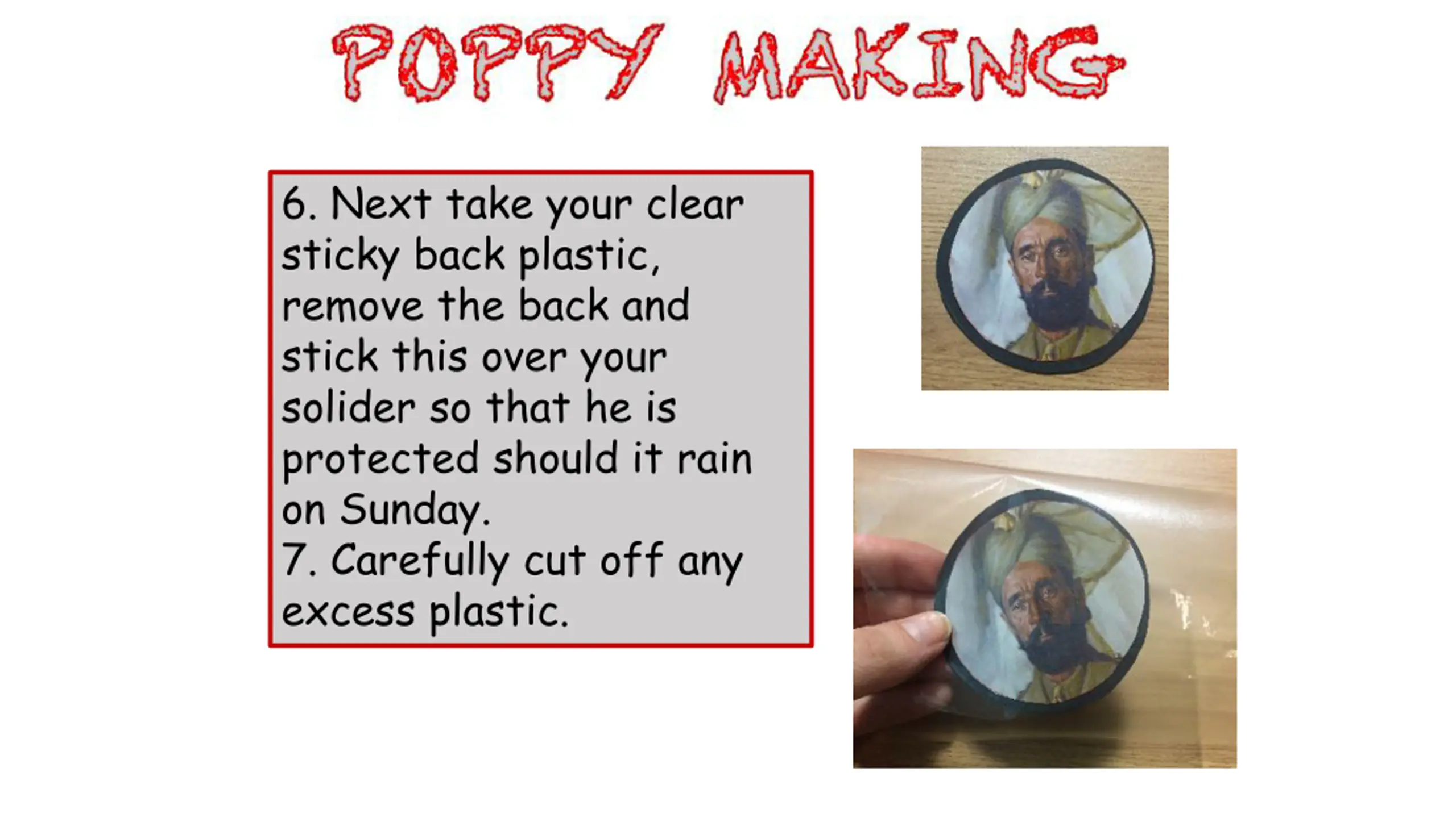 6. Next take your clear sticky back plastic, remove the back and stick this over your solider so that he is protected should it rain on Sunday. 7. Carefully cut off any excess plastic.