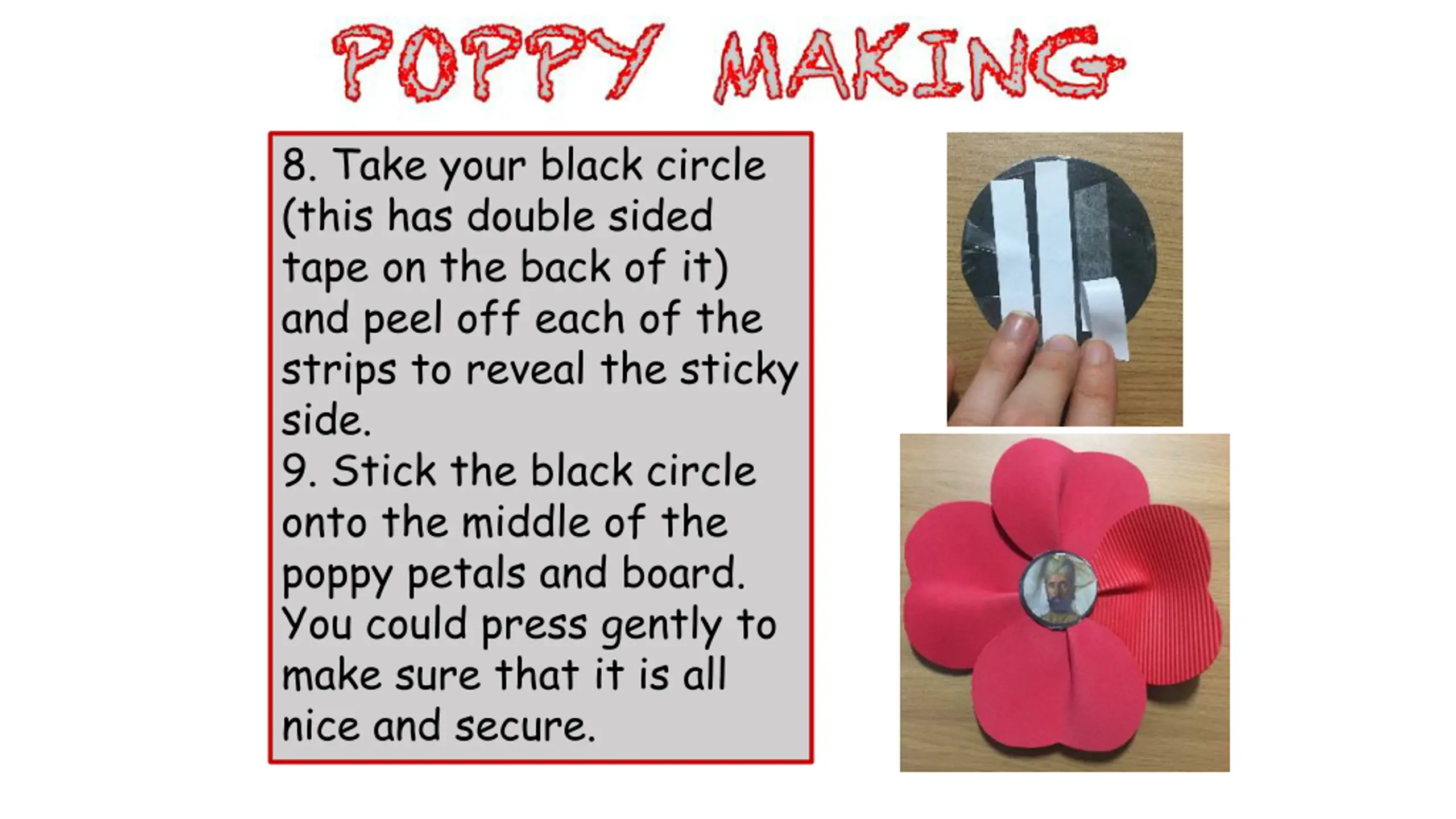 8. Take your black circle (this has double sided tape on the back of it) and peel off each of the strips to reveal the sticky side. 9. Stick the black circle onto the middle of the poppy petals and board. You could press gently to make sure that it is all nice and secure.