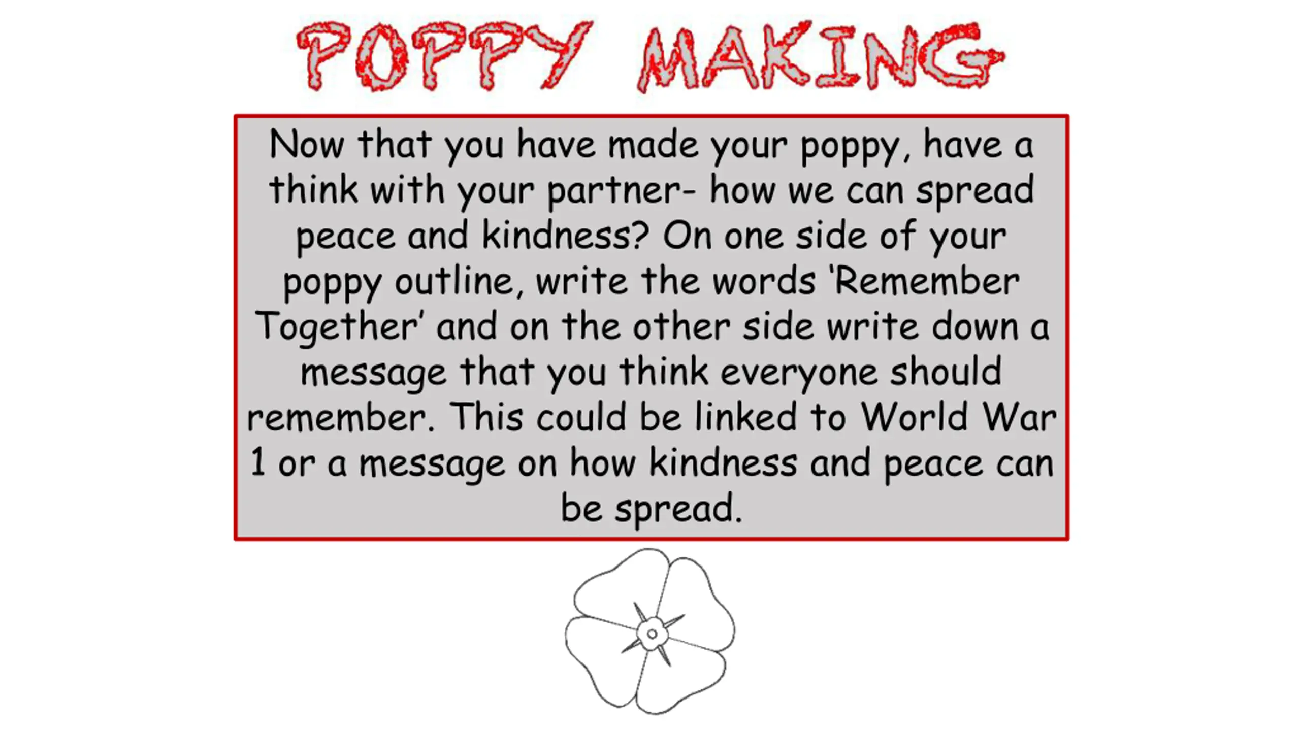 Now that you have made your poppy, have a think with your partner- how we can spread peace and kindness? On one side of your poppy outline, write the words Remember Together and on the other side write down a message that you think everyone should remember. This could be linked to World War 1 or a message on how kindness and peace can be spread.