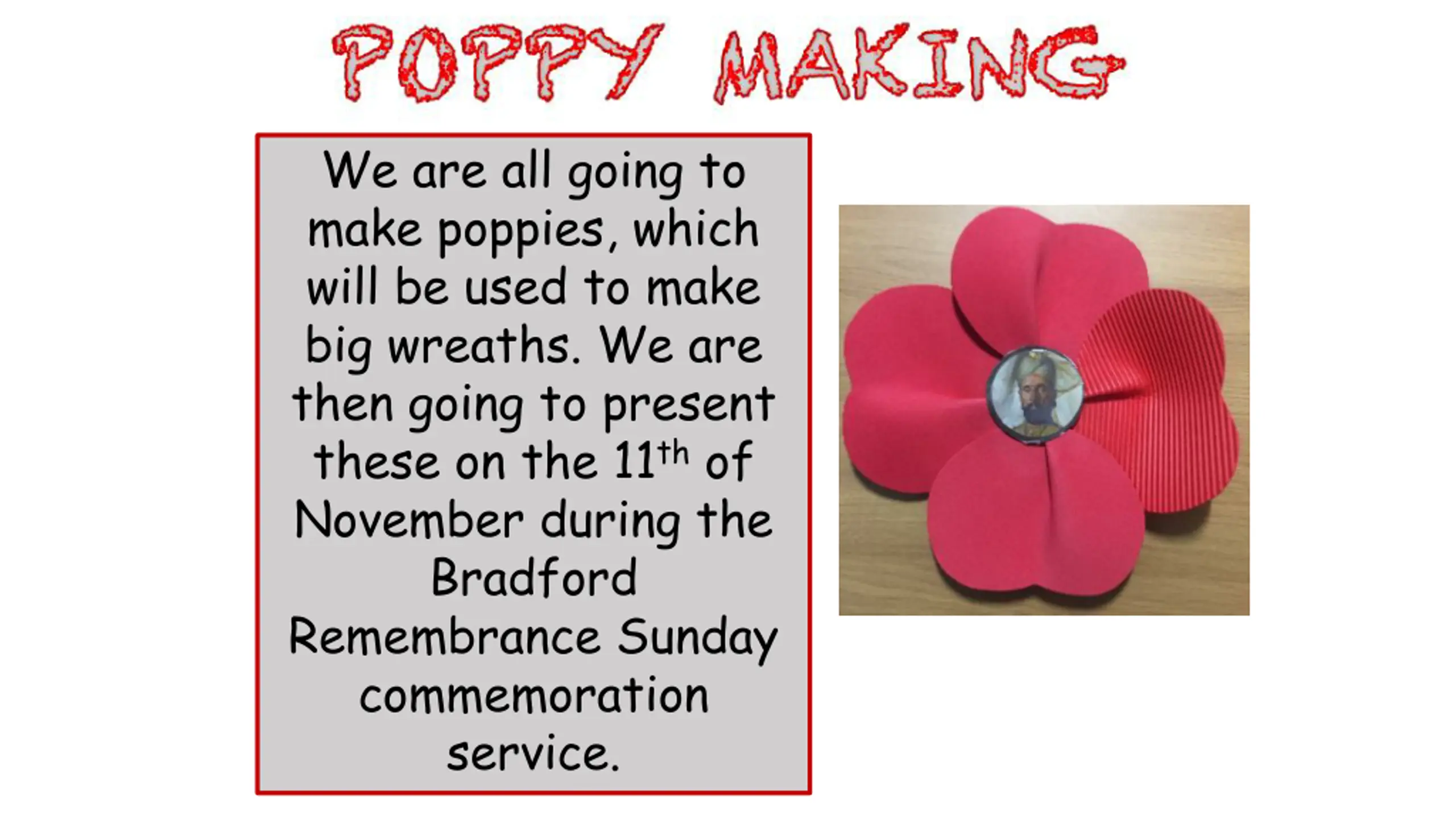 We are all going to make poppies, which will be used to make big wreaths. We are then going to present these on the 11th of November during the Bradford Remembrance Sunday commemoration service.