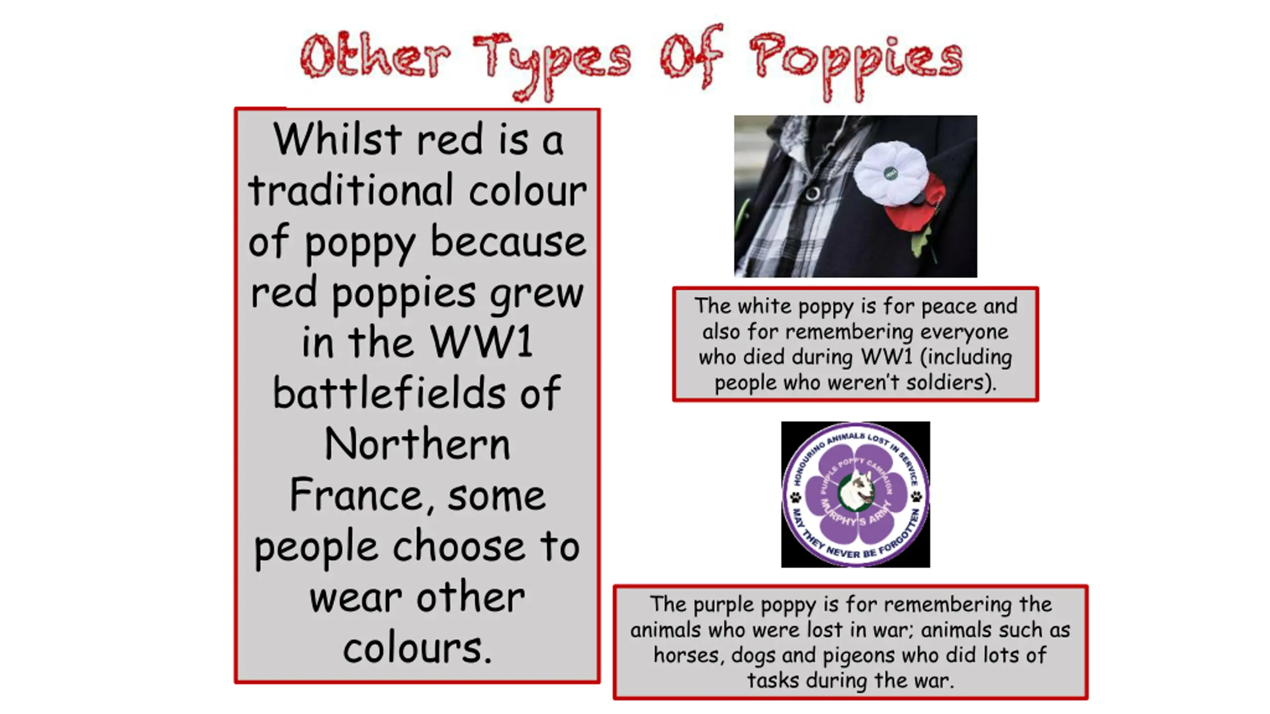 Whilst red is a traditional colour of poppy because red poppies grew in the WW1 battlefields of Northern France, some people choose to wear other colours. The white poppy is for peace and also for remembering everyone who died during WW1 (including people who weren t soldiers). The purple poppy is for remembering the animals who were lost in war; animals such as horses, dogs and pigeons who did lots of tasks during the war.