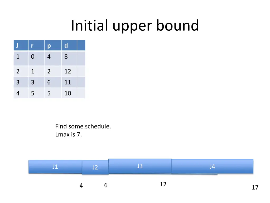 Initial upper bound J r p d 1 0 4 8 2 1 2 12 3 3 6 11 4 5 5 10 Find some schedule. Lmax is 7. J3 J4 J1 J2 12 6 4 17