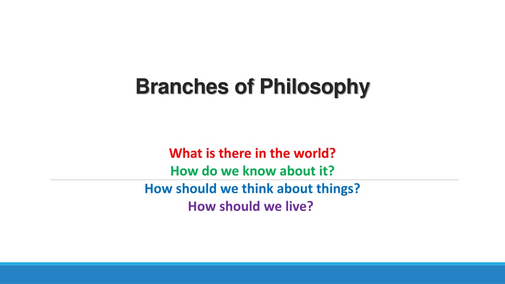 Branches of Philosophy What is therein the world? How do we know about it? How should we think about things? How should we live?