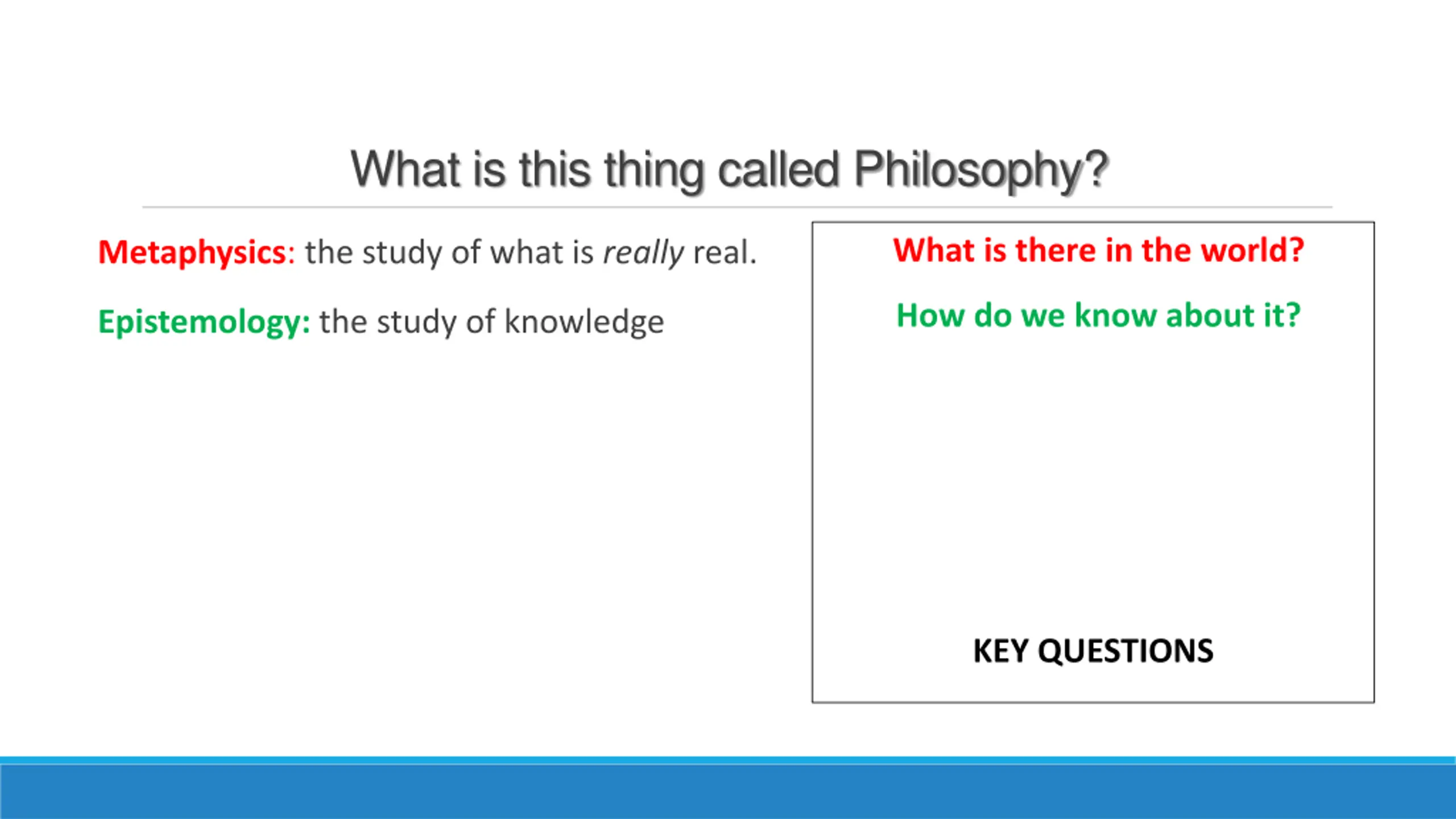 What is this thing called Philosophy? What is therein the world? Metaphysics: the study of what is really real. How do we know about it? Epistemology: the study of knowledge KEY QUESTIONS