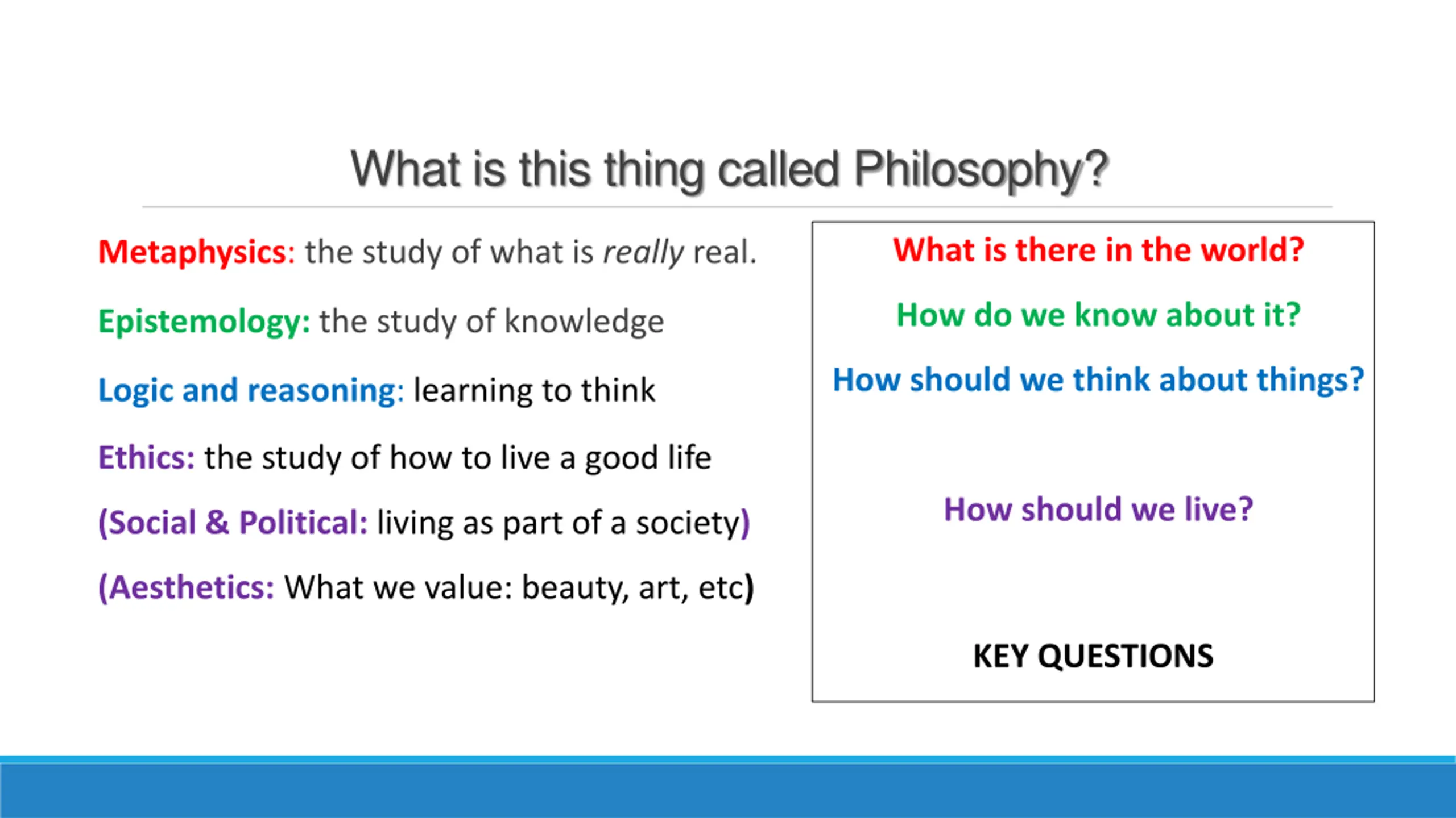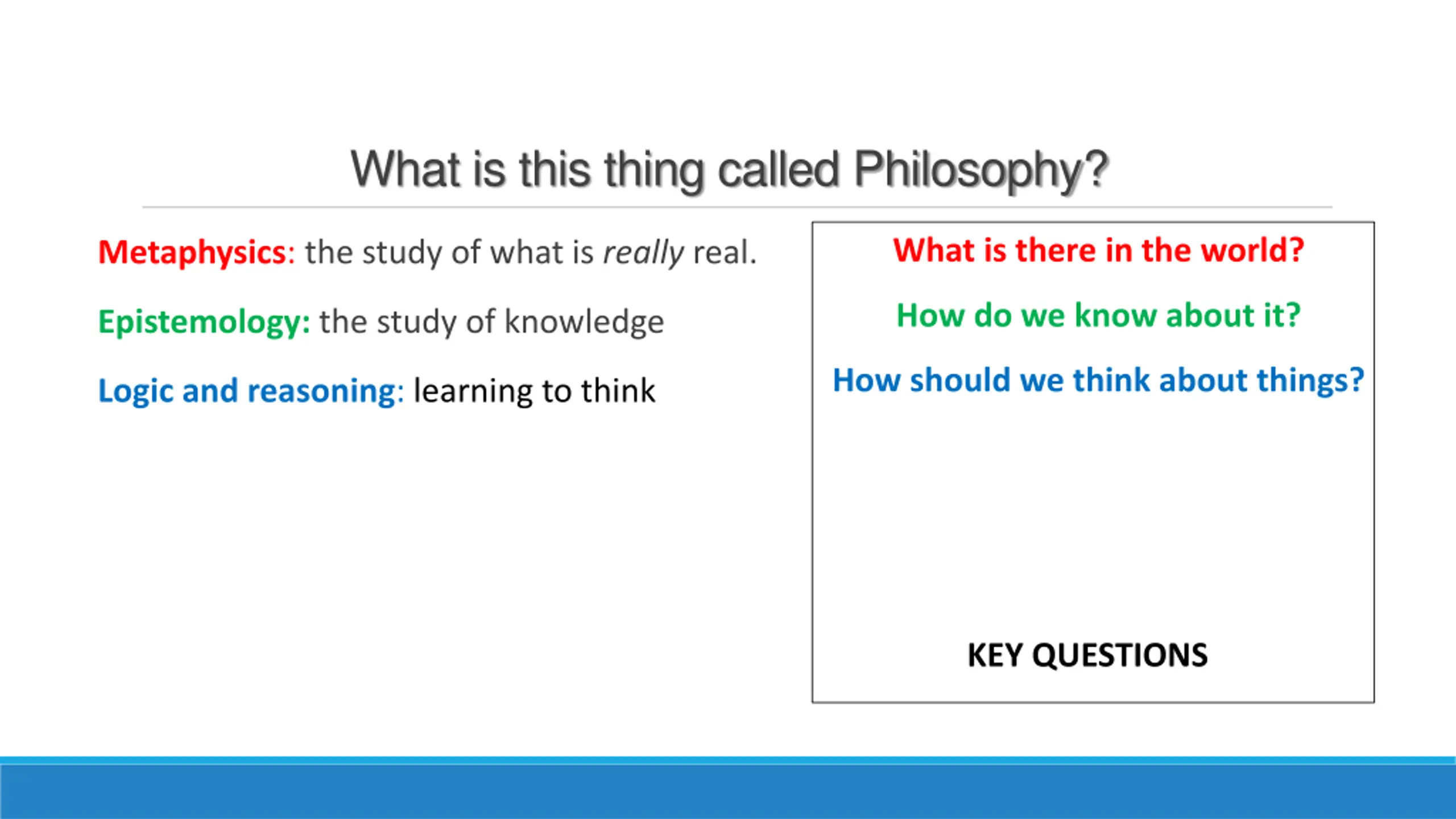 What is this thing called Philosophy? What is therein the world? Metaphysics: the study of what is really real. How do we know about it? Epistemology: the study of knowledge How should we think about things? Logic and reasoning: learning to think KEY QUESTIONS