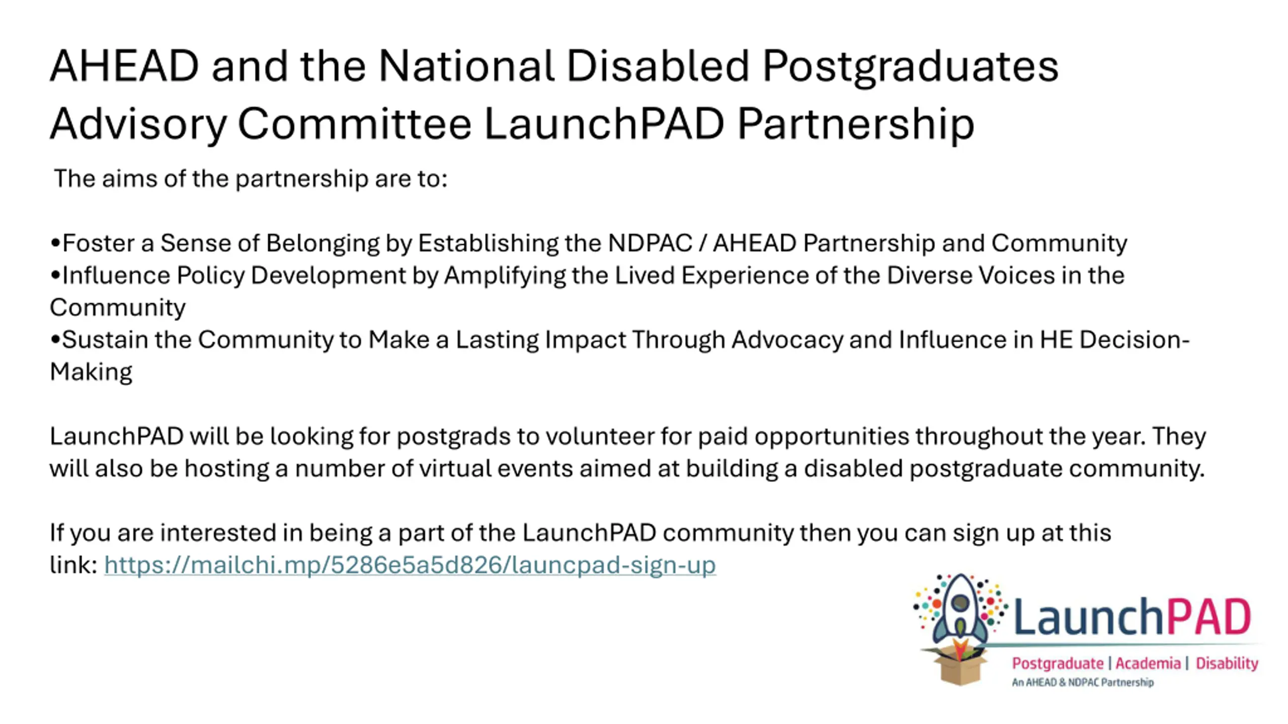 AHEAD and the National Disabled Postgraduates Advisory Committee LaunchPAD Partnership The aims of the partnership are to: Foster a Sense of Belonging by Establishing the NDPAC / AHEAD Partnership and Community Influence Policy Development by Amplifying the Lived Experience of the Diverse Voices in the Community Sustain the Community to Make a Lasting Impact Through Advocacy and Influence in HE Decision- Making LaunchPAD will be looking for postgrads to volunteer for paid opportunities throughout the year. They will also be hosting a number of virtual events aimed at building a disabled postgraduate community. If you are interested in being a part of the LaunchPAD community then you can sign up at this link: https://mailchi.mp/5286e5a5d826/launcpad-sign-up