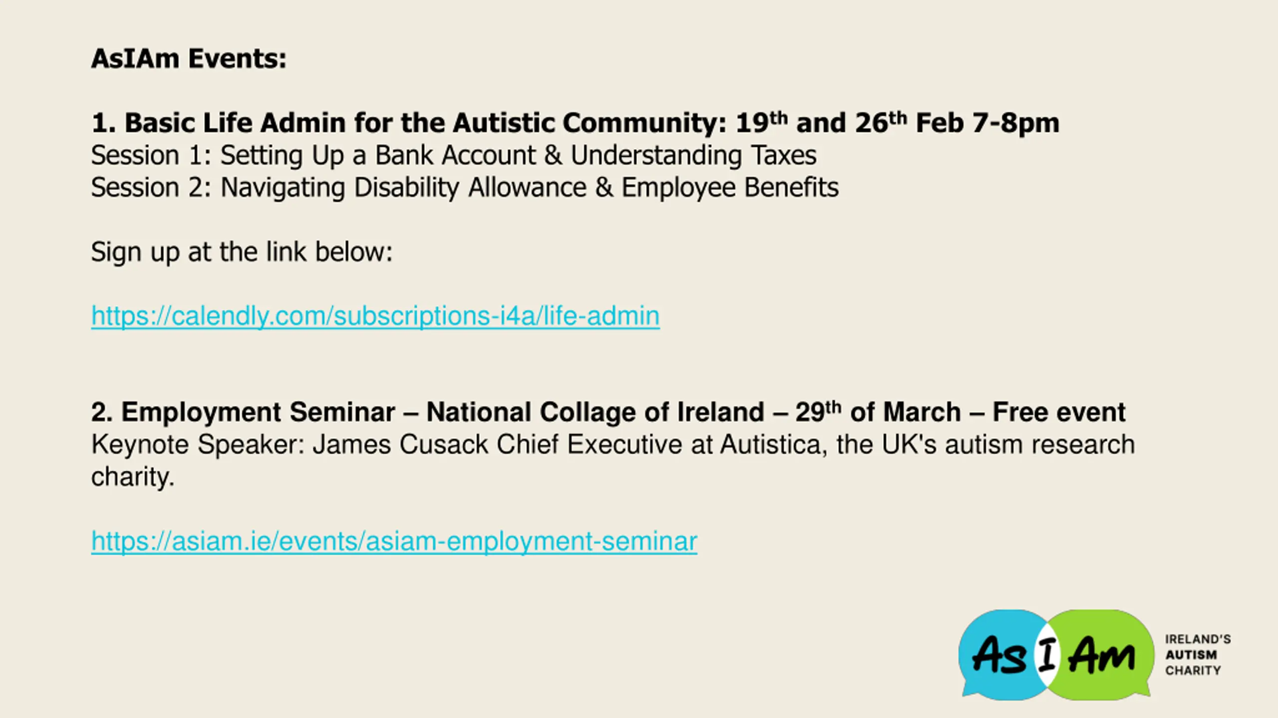 AsIAm Events: 1. Basic Life Admin for the Autistic Community: 19th and 26th Feb 7-8pm Session 1: Setting Up a Bank Account & Understanding Taxes Session 2: Navigating Disability Allowance & Employee Benefits Sign up at the link below: https://calendly.com/subscriptions-i4a/life-admin 2. Employment Seminar National Collage of Ireland 29th of March Free event Keynote Speaker: James Cusack Chief Executive at Autistica, the UK's autism research charity. https://asiam.ie/events/asiam-employment-seminar