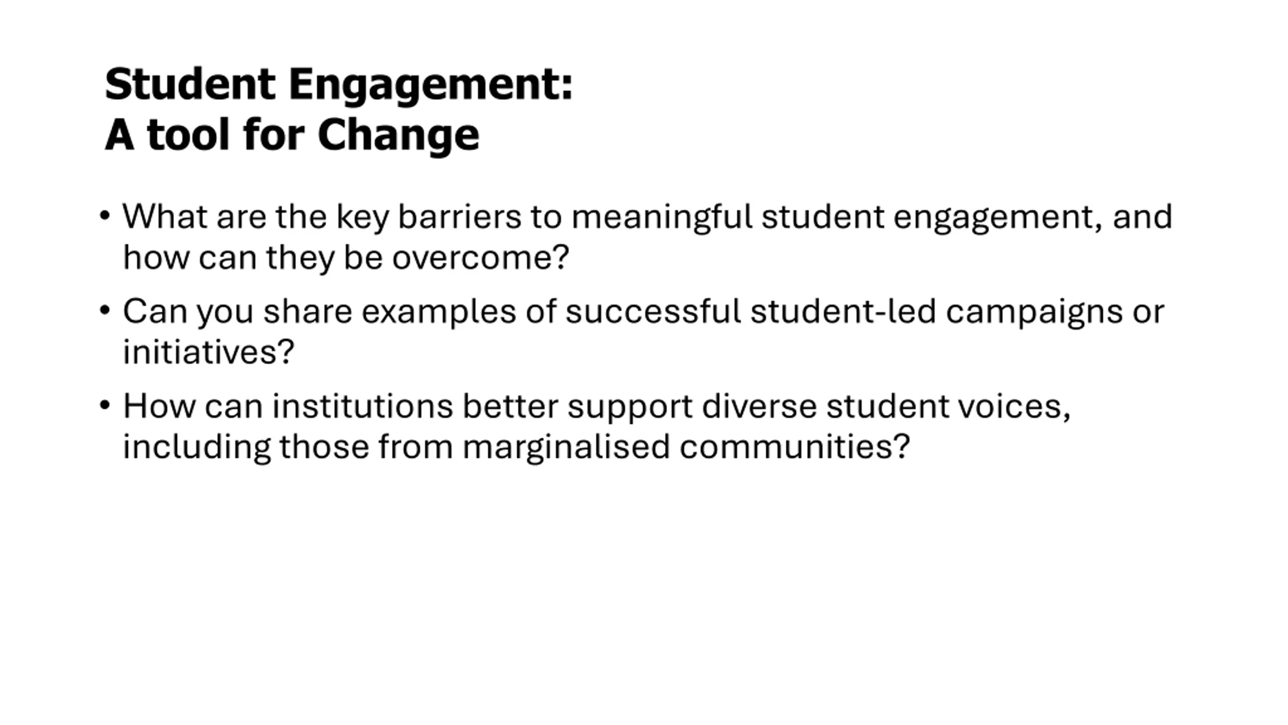 Student Engagement: A tool for Change What are the key barriers to meaningful student engagement, and how can they be overcome? Can you share examples of successful student-led campaigns or initiatives? How can institutions better support diverse student voices, including those from marginalised communities?