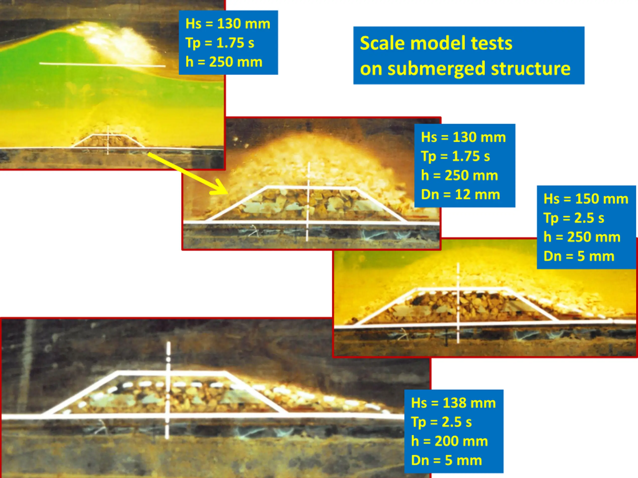 Hs = 130 mm Tp = 1.75 s h = 250 mm Scale model tests on submerged structure Hs = 130 mm Tp = 1.75 s h = 250 mm Dn = 12 mm Hs = 150 mm Tp = 2.5 s h = 250 mm Dn = 5 mm Hs = 138 mm Tp = 2.5 s h = 200 mm Dn = 5 mm