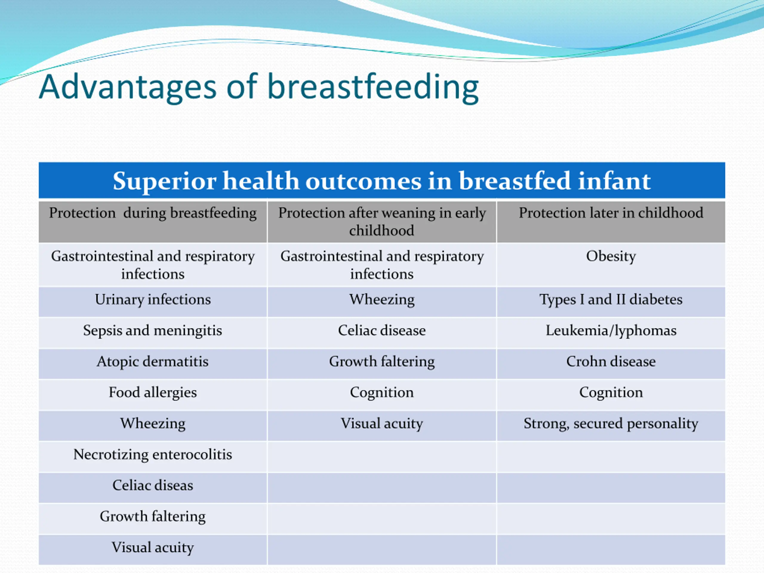 Advantages of breastfeeding Superiorhealth outcomes in breastfed infant Protection during breastfeeding Protection after weaning in early childhood Protection later in childhood Gastrointestinal and respiratory infections Gastrointestinal and respiratory infections Obesity Urinary infections Wheezing Types I and II diabetes Sepsis and meningitis Celiac disease Leukemia/lyphomas Atopic dermatitis Growth faltering Crohn disease Food allergies Cognition Cognition Wheezing Visual acuity Strong, secured personality Necrotizing enterocolitis Celiac diseas Growth faltering Visual acuity