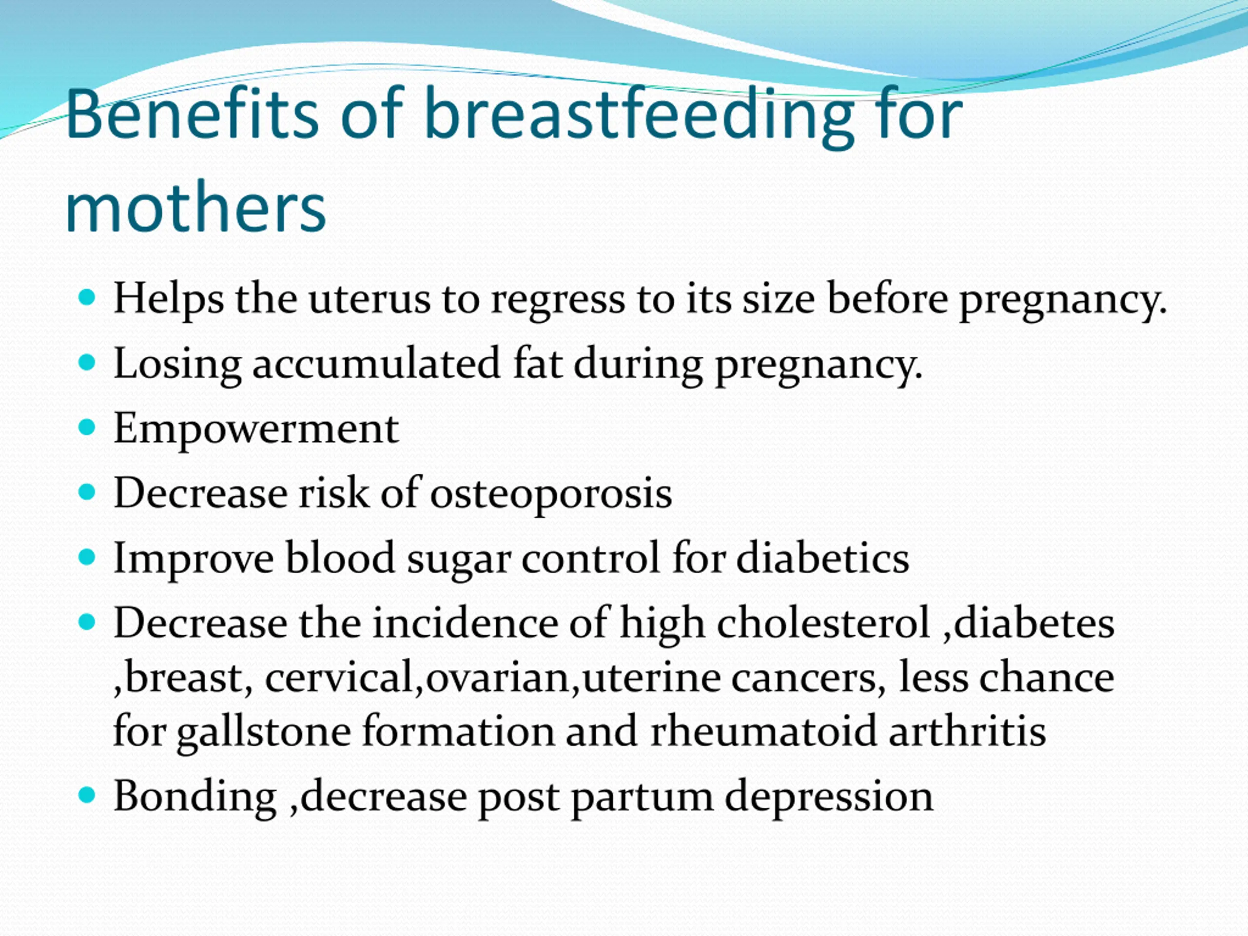 Benefits of breastfeeding for mothers Helps the uterus to regress to its size before pregnancy. Losing accumulated fat during pregnancy. Empowerment Decrease risk of osteoporosis Improve blood sugar control for diabetics Decrease the incidence of high cholesterol ,diabetes ,breast, cervical,ovarian,uterine cancers, less chance for gallstone formation and rheumatoid arthritis Bonding ,decrease post partum depression