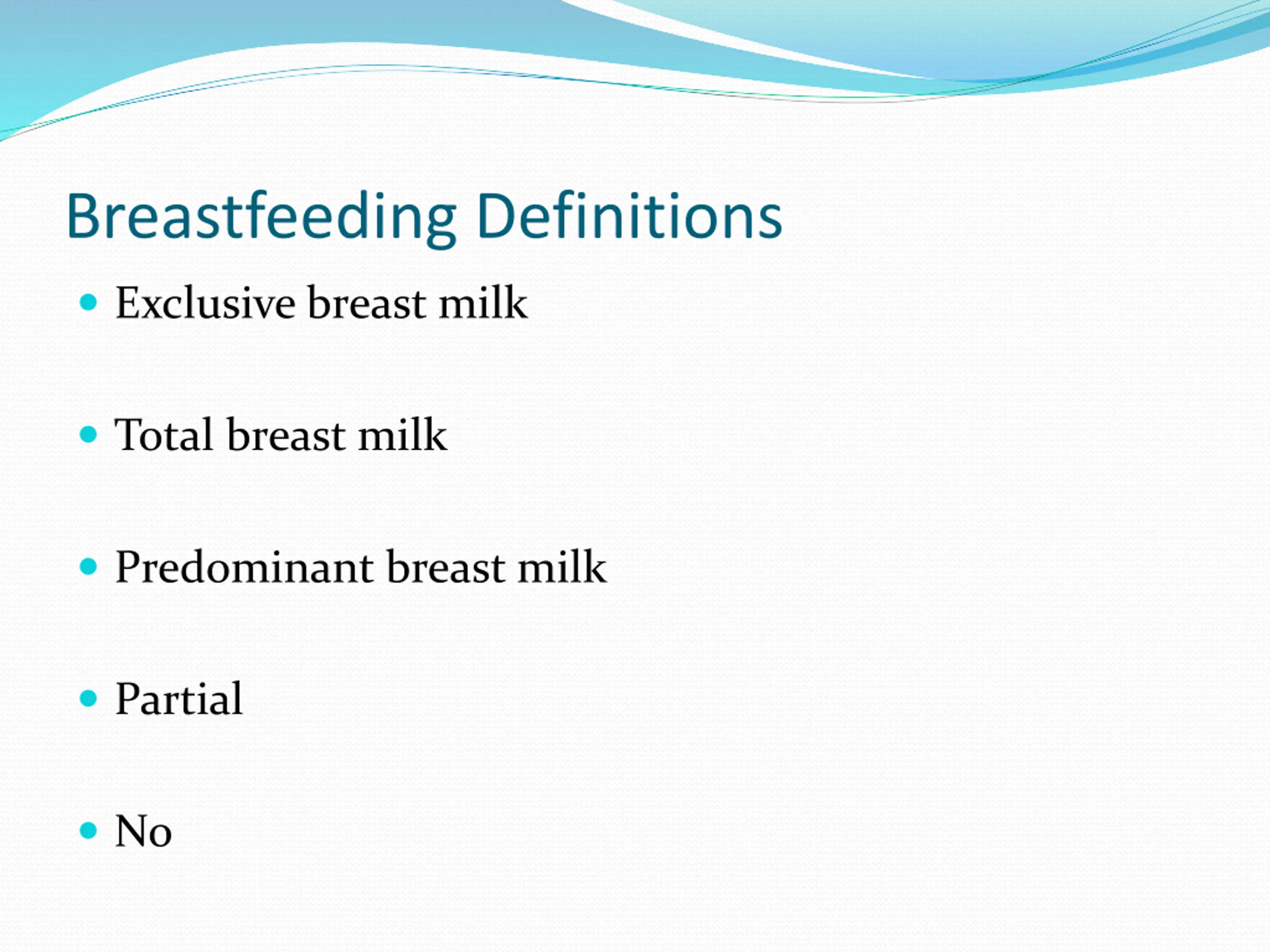 Breastfeeding Definitions Exclusive breast milk Total breast milk Predominant breast milk Partial No