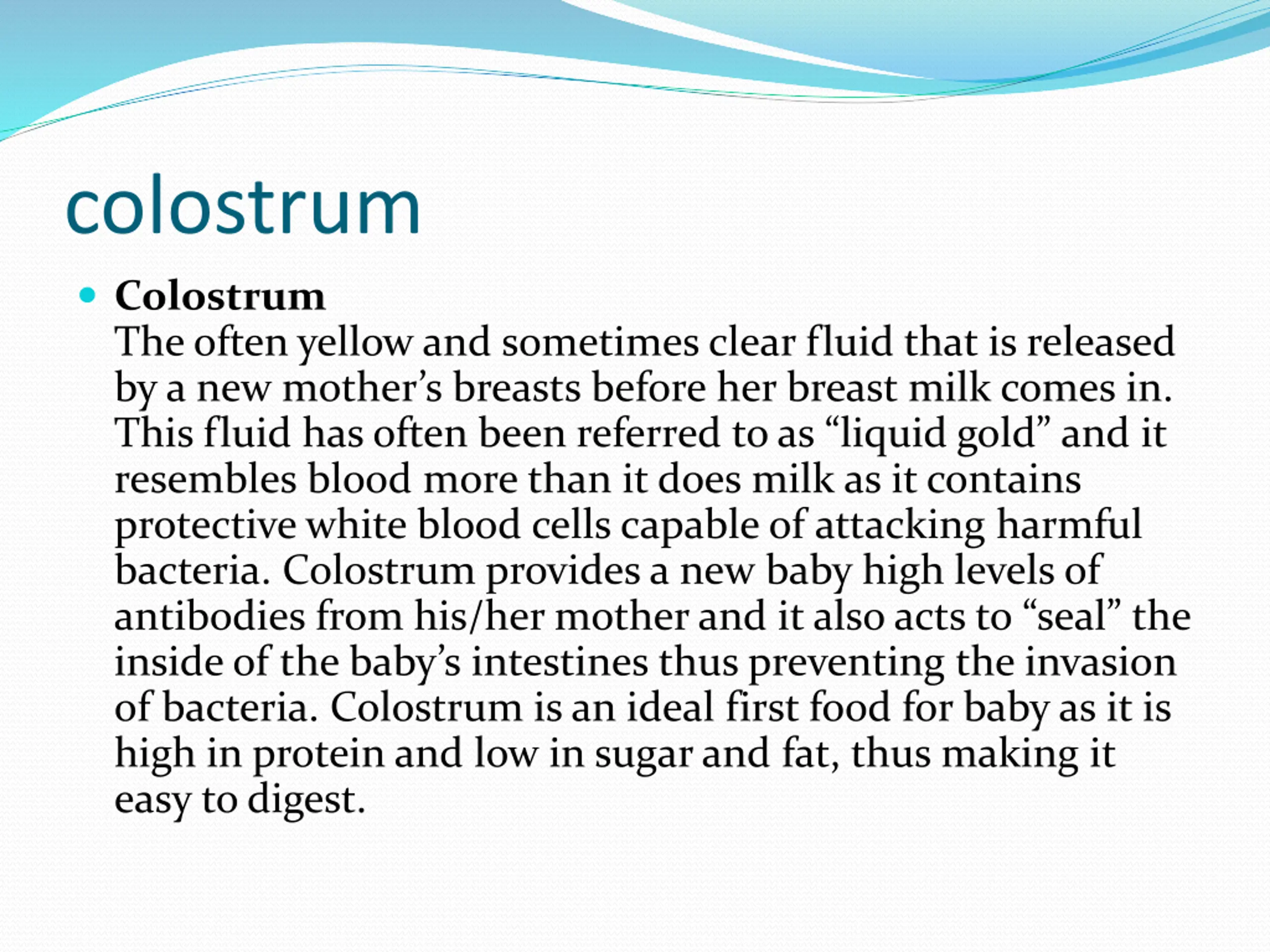 colostrum Colostrum The often yellow and sometimes clear fluid that is released by a new mother s breasts before her breast milk comes in. This fluid has often been referred to as liquid gold and it resembles blood more than it does milk as it contains protective white blood cells capable of attacking harmful bacteria. Colostrum provides a new baby high levels of antibodies from his/her mother and it also acts to seal the inside of the baby s intestines thus preventing the invasion of bacteria. Colostrum is an ideal first food for baby as it is high in protein and low in sugar and fat, thus making it easy to digest.