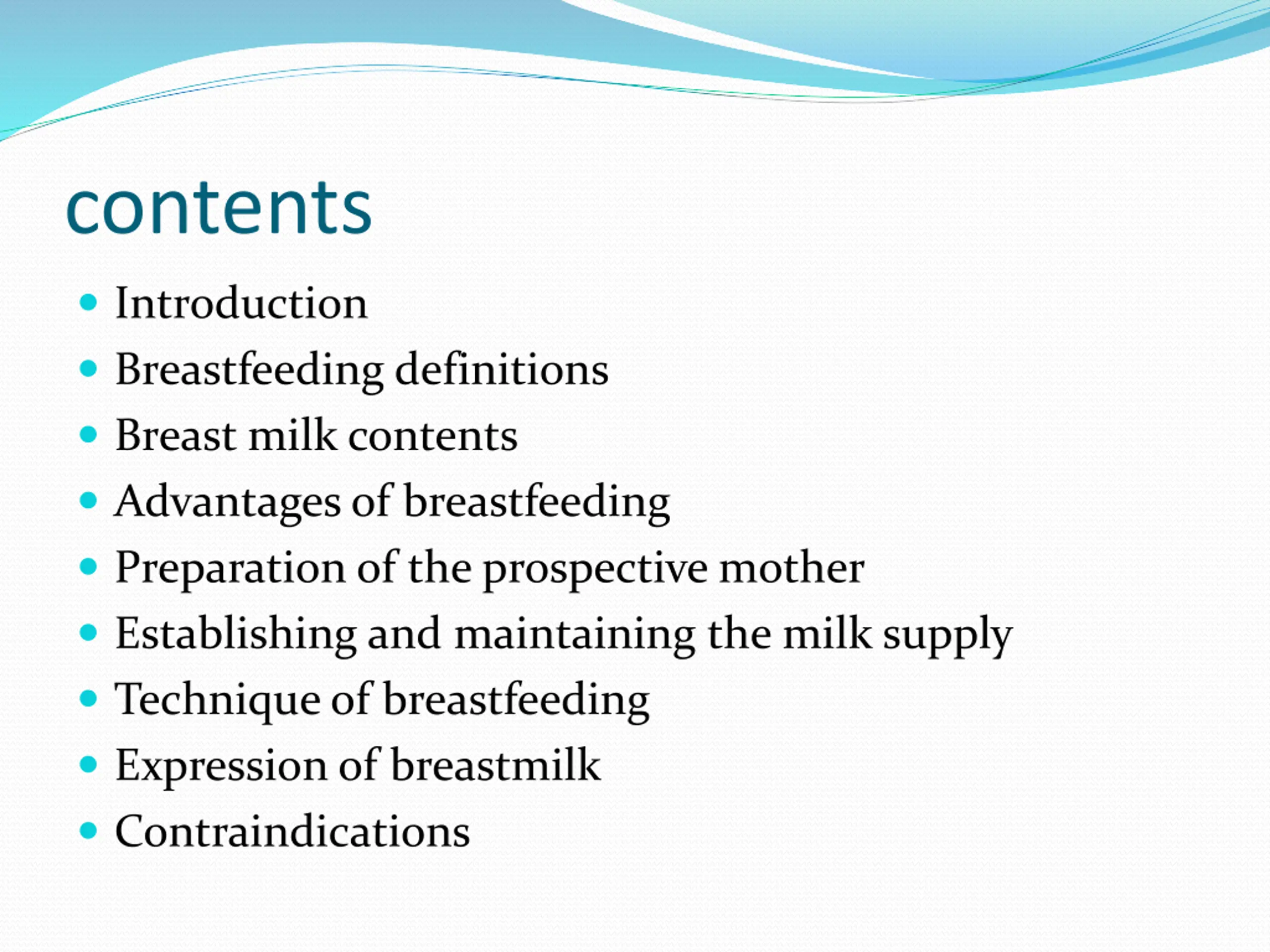 contents Introduction Breastfeeding definitions Breast milk contents Advantages of breastfeeding Preparation of the prospective mother Establishing and maintaining the milk supply Technique of breastfeeding Expression of breastmilk Contraindications