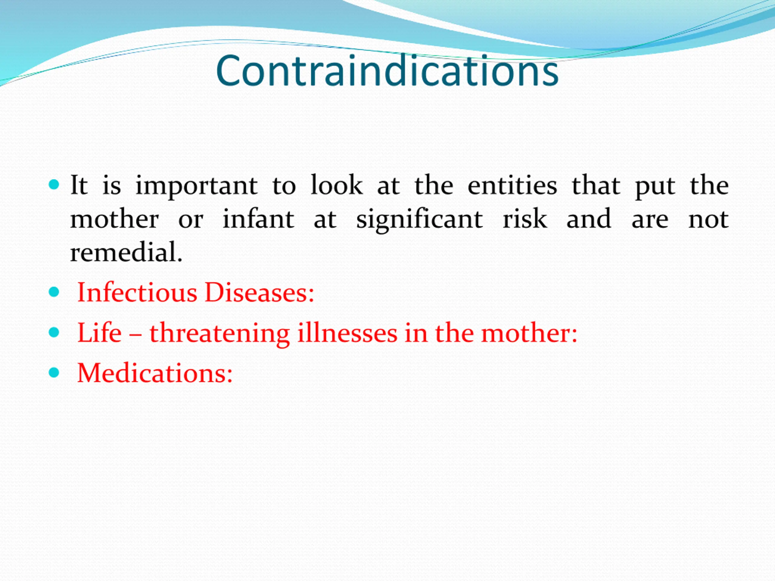 Contraindications It is important to look at the entities that put the mother or infant at significant risk and are not remedial. Infectious Diseases: Life threatening illnesses in the mother: Medications: