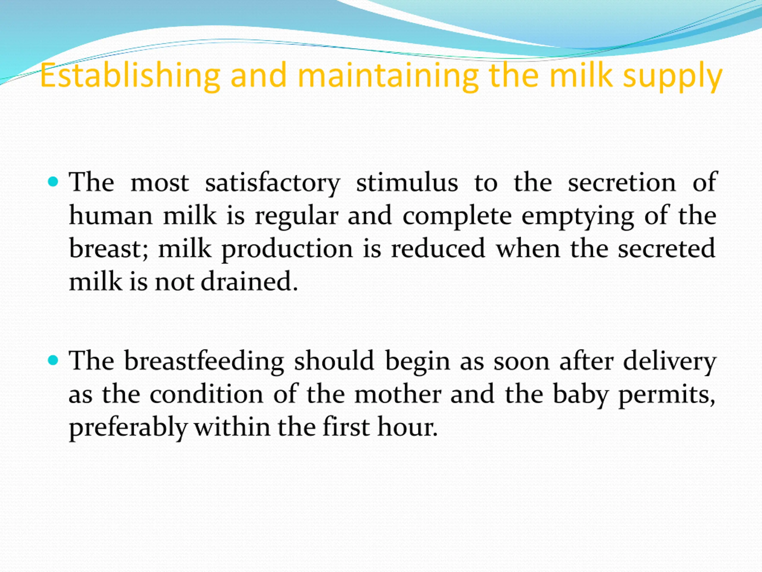 Establishing and maintaining the milk supply The most satisfactory stimulus to the secretion of human milk is regular and complete emptying of the breast; milk production is reduced when the secreted milk is notdrained. The breastfeeding should begin as soon after delivery as the condition of the mother and the baby permits, preferably within the first hour.